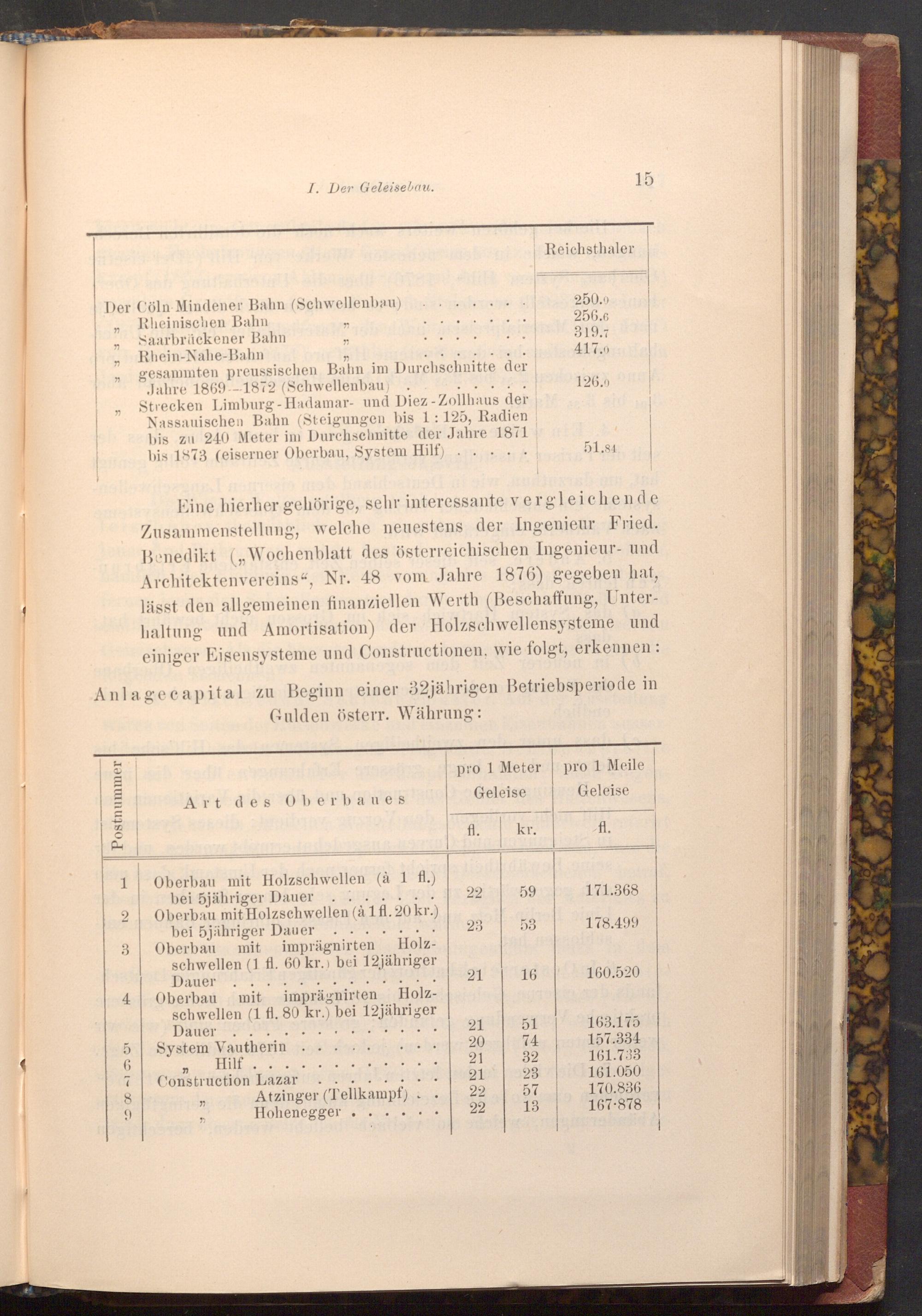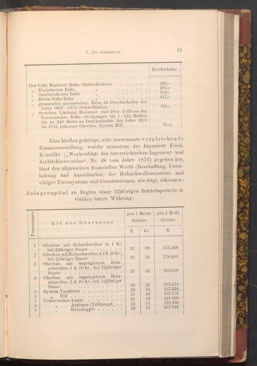 Eine hierher gehörige, sehr interessante vergleichende Zusammenstellung, welche neuestens der Ingenieur Fried. Benedikt( Wochenblatt des österreichischen Ingenieur- und Architektenvereins", Nr. 48 vom Jahre 1876) gegeben hat, lässt den allgemeinen finanziellen Werth( Beschaffung, Unterhaltung und Amortisation) der Holzschwellensysteme und einiger Eisensysteme und Constructionen, wie folgt, erkennen: Anlagecapital zu Beginn einer 32jährigen Betriebsperiode in Gulden österr. Währung: