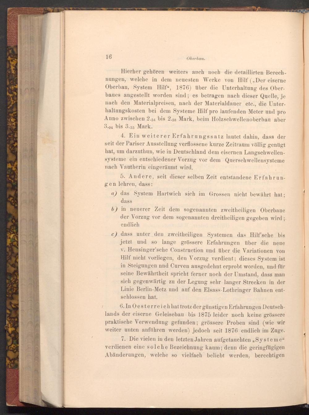 Hierher gehören weiters auch noch die detaillirten Berechnungen, welche in dem neuesten Werke von Hilf(„ Der eiserne Oberbau, System Hilf", 1876) über die Unterhaltung des Oberbaues angestellt worden sind; es betragen nach dieser Quelle, je nach den Materialpreisen, nach der Materialdauer etc., die Unterhaltungskosten bei dem Systeme Hilf pro laufenden Meter und pro Anno zwischen 2.54 bis 2.58 Mark, beim Holzschwellenoberbau aber 3.04 bis 3.35 Mark.