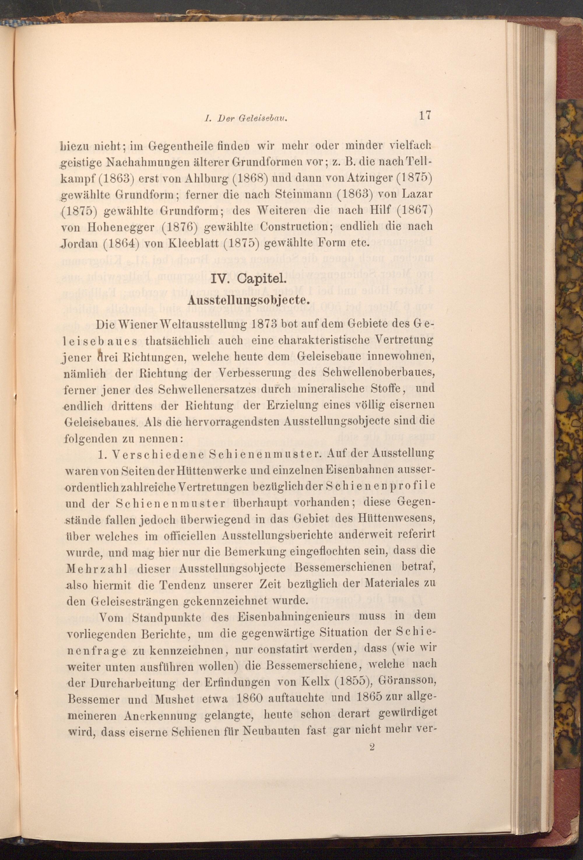 Die Wiener Weltausstellung 1873 bot auf dem Gebiete des Geleisebaues thatsächlich auch eine charakteristische Vertretung jener drei Richtungen, welche heute dem Geleisebaue innewohnen, nämlich der Richtung der Verbesserung des Schwellenoberbaues, ferner jener des Schwellenersatzes durch mineralische Stoffe, und endlich drittens der Richtung der Erzielung eines völlig eisernen Geleisebaues. Als die hervorragendsten Ausstellungsobjecte sind die folgenden zu nennen: