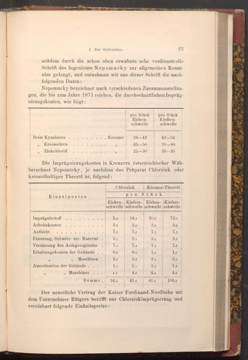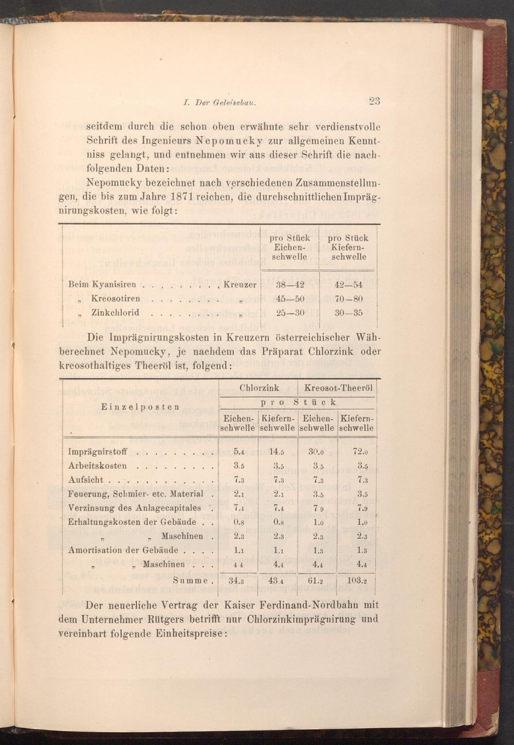 Nepomucky bezeichnet nach verschiedenen Zusammenstellungen, die bis zum Jahre 1871 reichen, die durchschnittlichen Imprägnirungskosten, wie folgt: