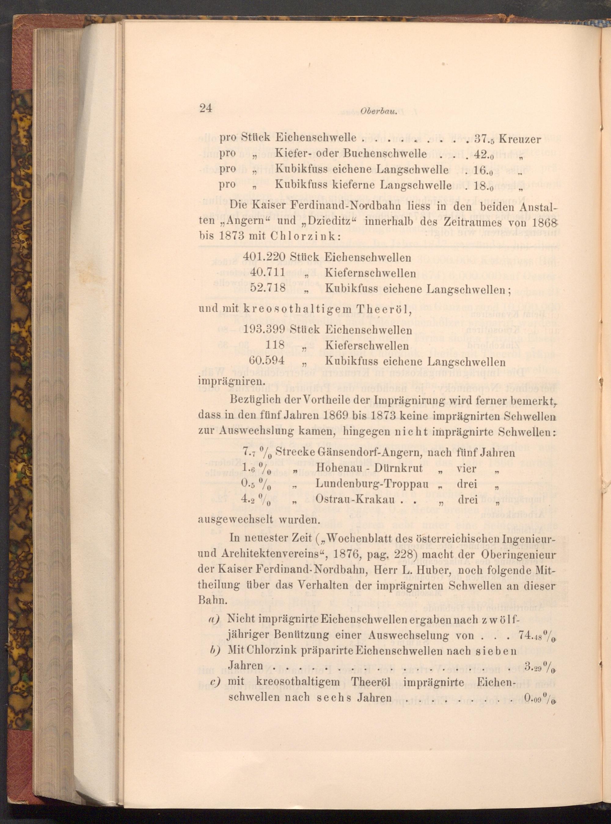 In neuester Zeit( ,, Wochenblatt des österreichischen Ingenieurund Architektenvereins", 1876, pag. 228) macht der Oberingenieur der Kaiser Ferdinand- Nordbahn, Herr L. Huber, noch folgende Mittheilung über das Verhalten der imprägnirten Schwellen an dieser Bahn.