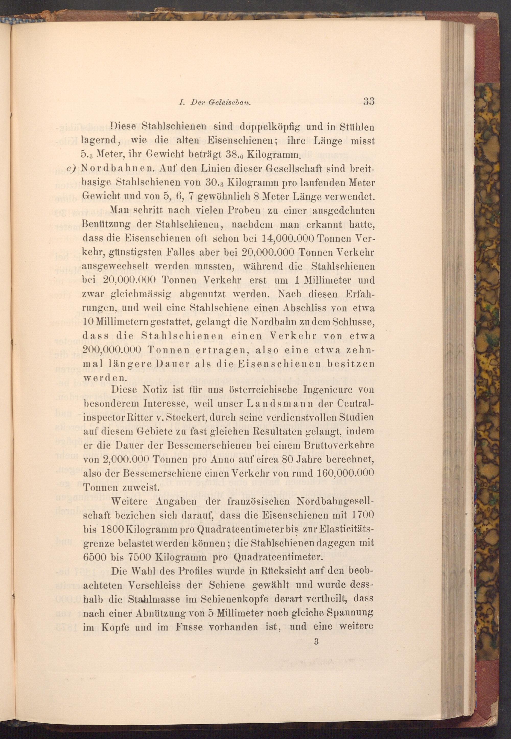 Man schritt nach vielen Proben zu einer ausgedehnten Benützung der Stahlschienen, nachdem man erkannt hatte, dass die Eisenschienen oft schon bei 14,000.000 Tonnen Verkehr, günstigsten Falles aber bei 20,000.000 Tonnen Verkehr ausgewechselt werden mussten, während die Stahlschienen bei 20,000.000 Tonnen Verkehr erst um 1 Millimeter und zwar gleichmässig abgenutzt werden. Nach diesen Erfahrungen, und weil eine Stahlschiene einen Abschliss von etwa 10 Millimetern gestattet, gelangt die Nordbahn zu dem Schlusse, dass die Stahlschienen einen Verkehr von etwa 200,000.000 Tonnen ertragen, also eine etwa zehnmal längere Dauer als die Eisenschienen besitzen werden.