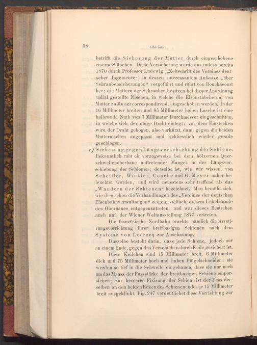 ban tilotagg Dasselbe besteht darin, dass jede Schiene, jedoch nur an einem Ende, gegen das Verschieben durch Keile gesichert ist. Diese Keilchen sind 15 Millimeter breit, 6 Millimeter dick und 75 Millimeter hoch und haben Flügelschneiden; sie werden so tief in die Schwelle eingehauen, dass sie nur noch um das Maass der Fussstärke der breitbasigen Schiene emporstehen; zur besseren Fixirung der Schiene ist der Fuss derselben an den beiden Ecken des Schienenendes je 15 Millimeter breit ausgeklinkt. Fig. 247 verdeutlichet diese Vorrichtung zur