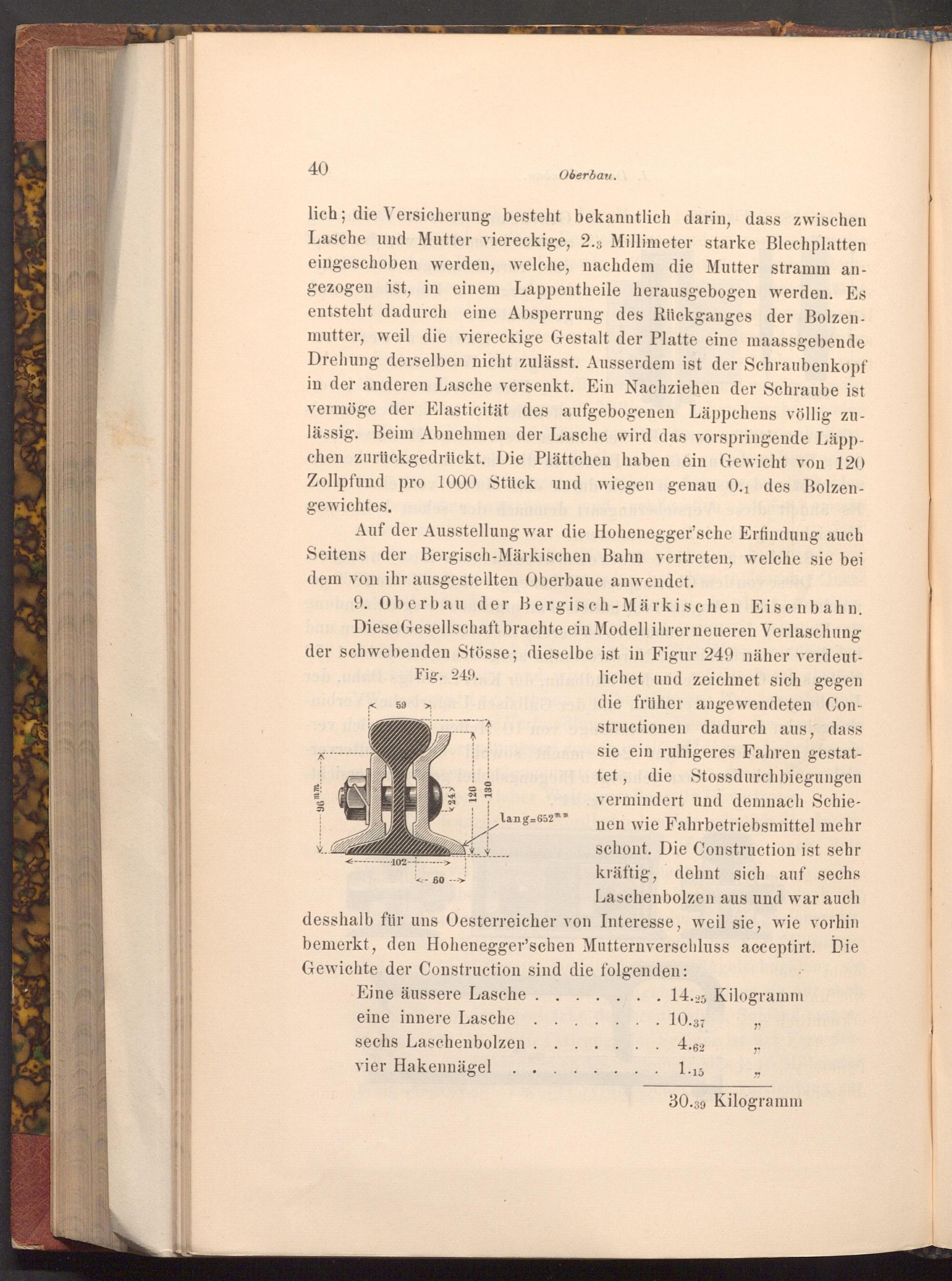9. Oberbau der Bergisch- Märkischen Eisenbahn. han Diese Gesellschaft brachte ein Modell ihrer neueren Verlaschung der schwebenden Stösse; dieselbe ist in Figur 249 näher verdeut