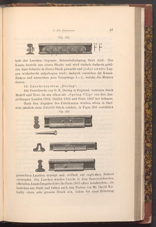 Todo Die Federlasche von G. E. Dering in England, vertreten durch Modell und Text, ist uns schon als„ Spring- Clip" von den Ausstellungen London 1862, Dublin 1865 und Paris 1867 her bekannt. doein Nach den Angaben des Fabrikanten werden allein in Sheffield jährlich circa 250.000 Stück solcher, in Figur 253 ersichtlich Fig. 253.