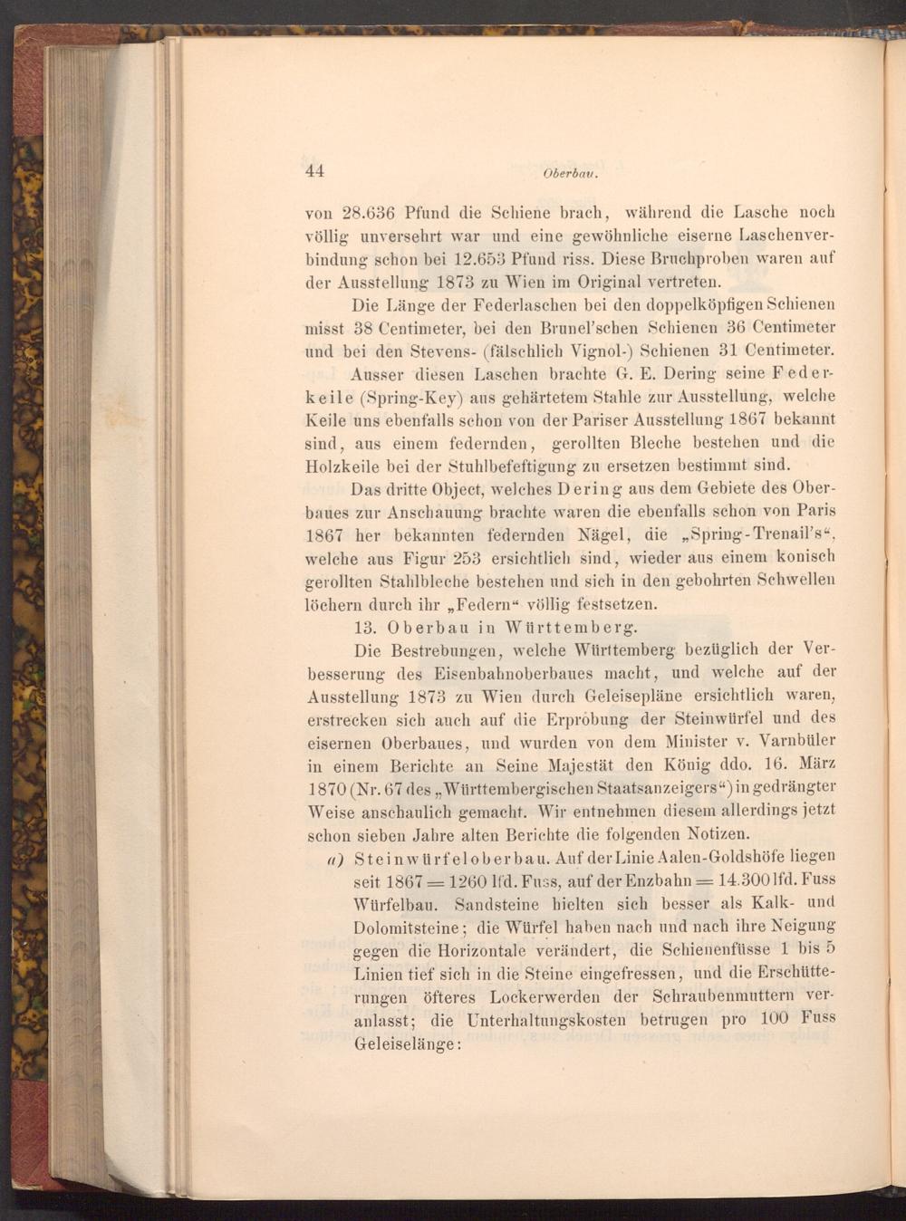 Die Bestrebungen, welche Württemberg bezüglich der Verbesserung des Eisenbahnoberbaues macht, und welche auf der Ausstellung 1873 zu Wien durch Geleisepläne ersichtlich waren, erstrecken sich auch auf die Erprobung der Steinwürfel und des eisernen Oberbaues, und wurden von dem Minister v. Varnbüler in einem Berichte an Seine Majestät den König ddo. 16. März 1870( Nr. 67 des ,, Württembergischen Staatsanzeigers") in gedrängter Weise anschaulich gemacht. Wir entnehmen diesem allerdings jetzt schon sieben Jahre alten Berichte die folgenden Notizen.