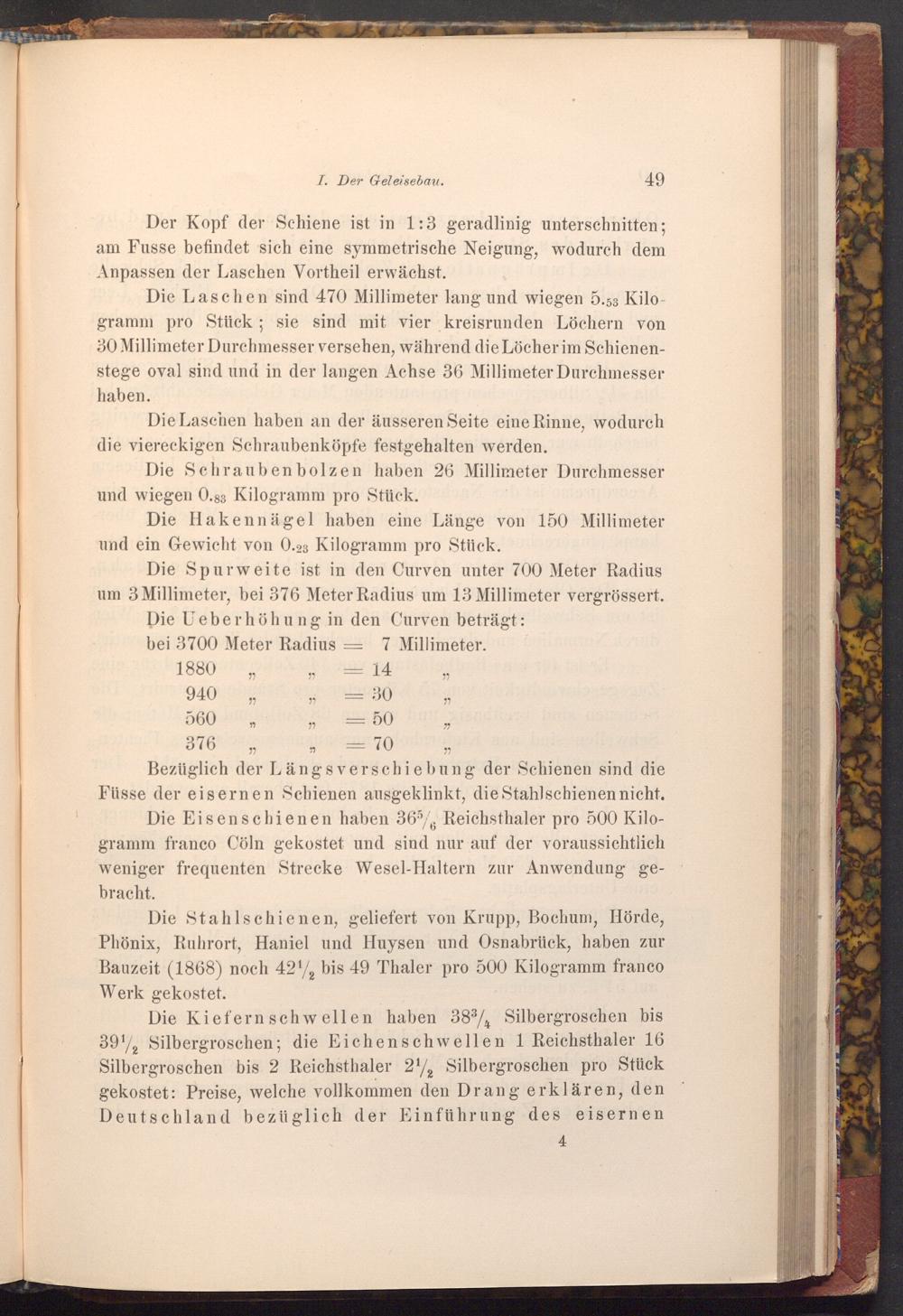 Die Kiefern schwellen haben 3834 Silbergroschen bis 39 Silbergroschen; die Eichenschwellen 1 Reichsthaler 16 Silbergroschen bis 2 Reichsthaler 2 Silbergroschen pro Stück 212 gekostet: Preise, welche vollkommen den Drang erklären, den Deutschland bezüglich der Einführung des eisernen