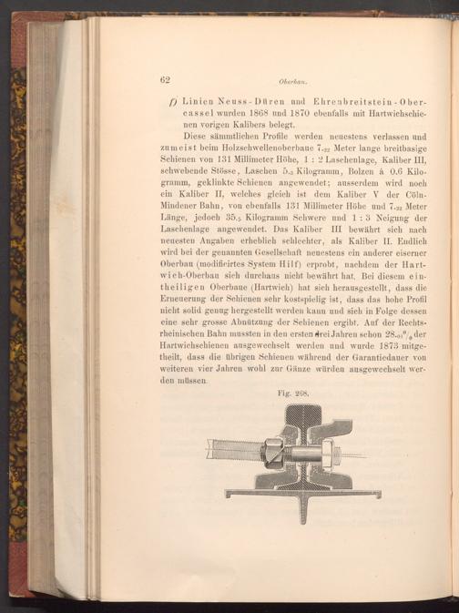 Diese sämmtlichen Profile werden neuestens verlassen und zumeist beim Holzschwellenoberbaue 7.22 Meter lange breitbasige Schienen von 131 Millimeter Höhe, 1 2 Laschenlage, Kaliber III, schwebende Stösse, Laschen 5.3 Kilogramm, Bolzen à 0.6 Kilogramm, geklinkte Schienen angewendet; ausserdem wird noch ein Kaliber II, welches gleich ist dem Kaliber V der CölnMindener Bahn, von ebenfalls 131 Millimeter Höhe und 7.22 Meter Länge, jedoch 35.5 Kilogramm Schwere und 1: 3 Neigung der Laschenlage angewendet. Das Kaliber III bewährt sich nach neuesten Angaben erheblich schlechter, als Kaliber II. Endlich wird bei der genannten Gesellschaft neuestens ein anderer eiserner Oberbau( modificirtes System Hilf) erprobt, nachdem der Hartwich- Oberbau sich durchaus nicht bewährt hat. Bei diesem eintheiligen Oberbaue( Hartwich) hat sich herausgestellt, dass die Erneuerung der Schienen sehr kostspielig ist, dass das hohe Profil nicht solid genug hergestellt werden kann und sich in Folge dessen eine sehr grosse Abnützung der Schienen ergibt. Auf der Rechtsrheinischen Bahn mussten in den ersten drei Jahren schon 28.01% der Hartwichschienen ausgewechselt werden und wurde 1873 mitgetheilt, dass die übrigen Schienen während der Garantiedauer von weiteren vier Jahren wohl zur Gänze würden ausgewechselt werden müssen.