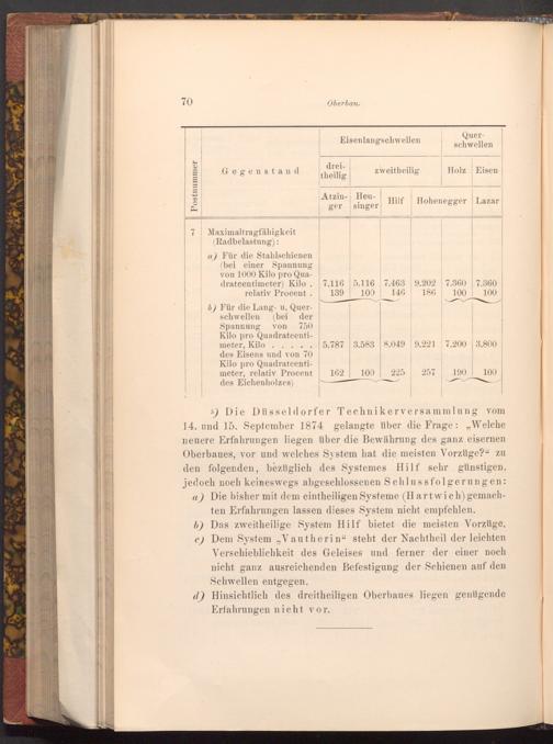 5) Die Düsseldorfer Technikerversammlung vom 14. und 15. September 1874 gelangte über die Frage: Welche neuere Erfahrungen liegen über die Bewährung des ganz eisernen Oberbaues, vor und welches System hat die meisten Vorzüge?" zu den folgenden, bezüglich des Systemes Hilf sehr günstigen, jedoch noch keineswegs abgeschlossenen Schlussfolgerungen: a) Die bisher mit dem eintheiligen Systeme( Hartwich) gemachten Erfahrungen lassen dieses System nicht empfehlen. b) Das zweitheilige System Hilf bietet die meisten Vorzüge. c) Dem System ,, Vautherin" steht der Nachtheil der leichten