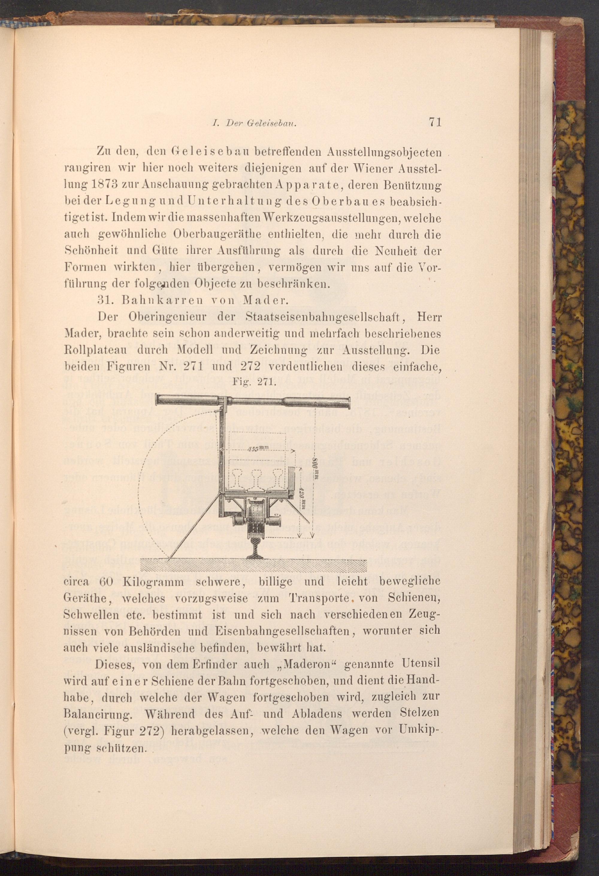 Der Oberingenieur der Staatseisenbahngesellschaft, Herr Mader, brachte sein schon anderweitig und mehrfach beschriebenes Rollplateau durch Modell und Zeichnung zur Ausstellung. Die beiden Figuren Nr. 271 und 272 verdeutlichen dieses einfache, Fig. 271.