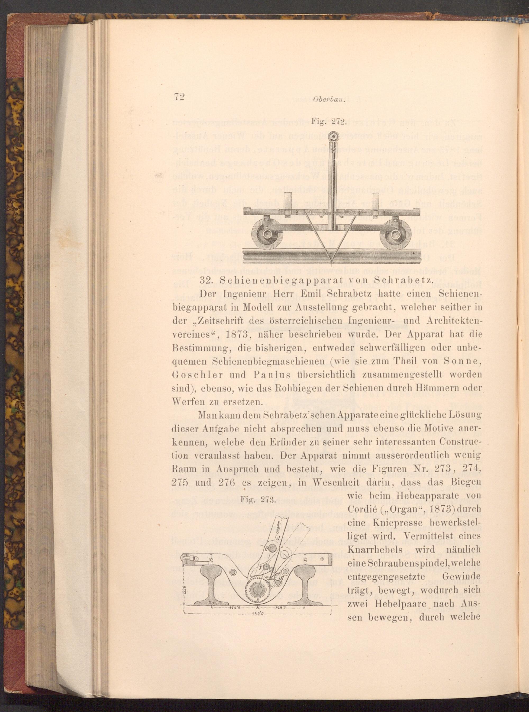 Man kann dem Schrabetz'schen Apparate eine glückliche Lösung dieser Aufgabe nicht absprechen und muss ebenso die Motive anerkennen, welche den Erfinder zu seiner sehr interessanten Construction veranlasst haben. Der Apparat nimmt ausserordentlich wenig Raum in Anspruch und besteht, wie die Figuren Nr. 273, 274, 275 und 276 es zeigen, in Wesenheit darin, dass das Biegen