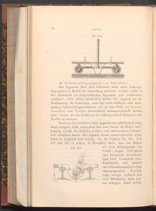Der Ingenieur Herr Emil Schrabetz hatte einen Schienenbiegapparat in Modell zur Ausstellung gebracht, welcher seither in der„ Zeitschrift des österreichischen Ingenieur- und Architektenvereines", 1873, näher beschrieben wurde. Der Apparat hat die Bestimmung, die bisherigen, entweder schwerfälligen oder unbequemen Schienenbiegmaschienen( wie sie zum Theil von Sonne, Goschler und Paulus übersichtlich zusammengestellt worden sind), ebenso, wie das Rohbiegen der Schienen durch Hämmern oder Werfen zu ersetzen.