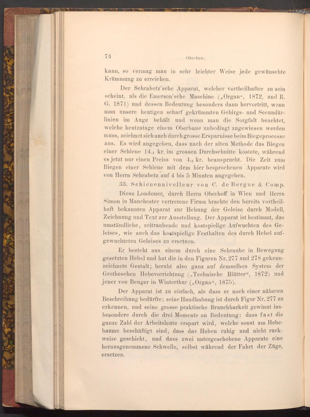 33. Schienennivelleur von C. de Bergue& Comp. Diese Londoner, durch Herrn Oberhoff in Wien und Herrn Simon in Manchester vertretene Firma brachte den bereits vortheilhaft bekannten Apparat zur Hebung der Geleise durch Modell, Zeichnung und Text zur Ausstellung. Der Apparat ist bestimmt, das umständliche, zeitraubende und kostspielige Aufwuchten des Geleises, wie auch das kostspielige Festhalten des durch Hebel aufgewuchteten Geleises zu ersetzen.