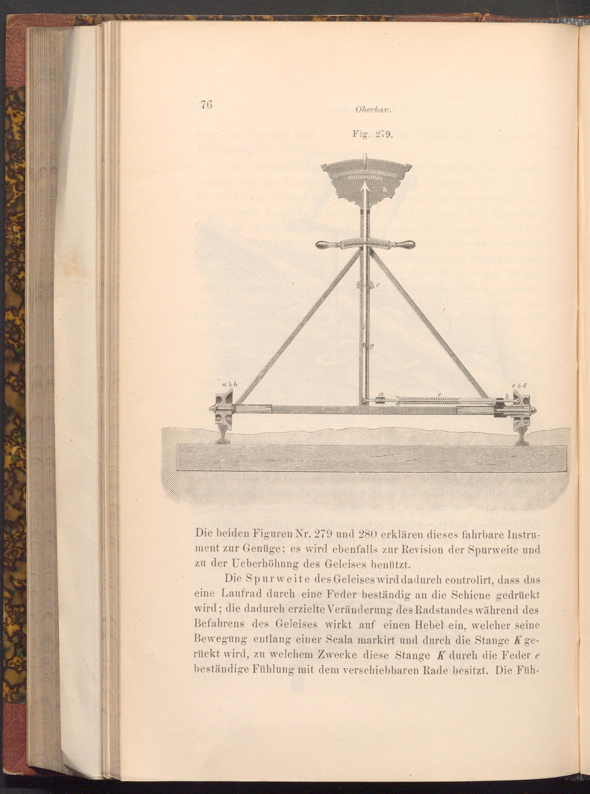 Die beiden Figuren Nr. 279 und 280 erklären dieses fahrbare Instrument zur Genüge; es wird ebenfalls zur Revision der Spurweite und zu der Ueberhöhung des Geleises benützt.