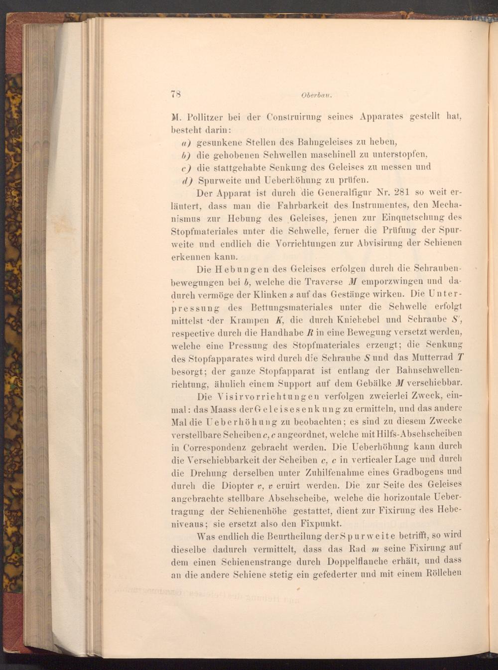 Der Apparat ist durch die Generalfigur Nr. 281 so weit erläutert, dass man die Fahrbarkeit des Instrumentes, den Mechanismus zur Hebung des Geleises, jenen zur Einquetschung des Stopfmateriales unter die Schwelle, ferner die Prüfung der Spurweite und endlich die Vorrichtungen zur Abvisirung der Schienen erkennen kann.