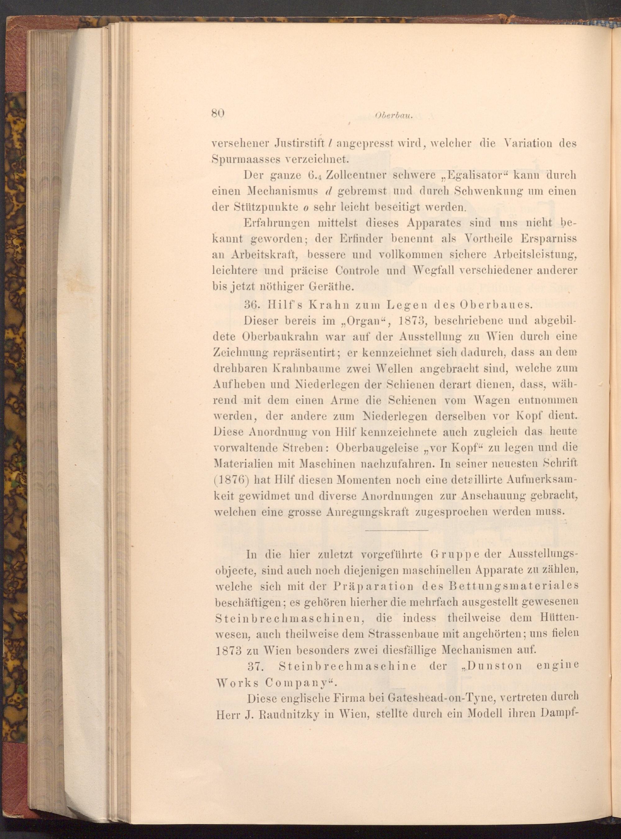 Dieser bereis im„ Organ", 1873, beschriebene und abgebildete Oberbaukrahn war auf der Ausstellung zu Wien durch eine Zeichnung repräsentirt; er kennzeichnet sich dadurch, dass an dem drehbaren Krahnbaume zwei Wellen angebracht sind, welche zum Aufheben und Niederlegen der Schienen derart dienen, dass, während mit dem einen Arme die Schienen vom Wagen entnommen werden, der andere zum Niederlegen derselben vor Kopf dient. Diese Anordnung von Hilf kennzeichnete auch zugleich das heute vorwaltende Streben: Oberbaugeleise ,, vor Kopf" zu legen und die Materialien mit Maschinen nachzufahren. In seiner neuesten Schrift ( 1876) hat Hilf diesen Momenten noch eine detaillirte Aufmerksamkeit gewidmet und diverse Anordnungen zur Anschauung gebracht, welchen eine grosse Anregungskraft zugesprochen werden muss.