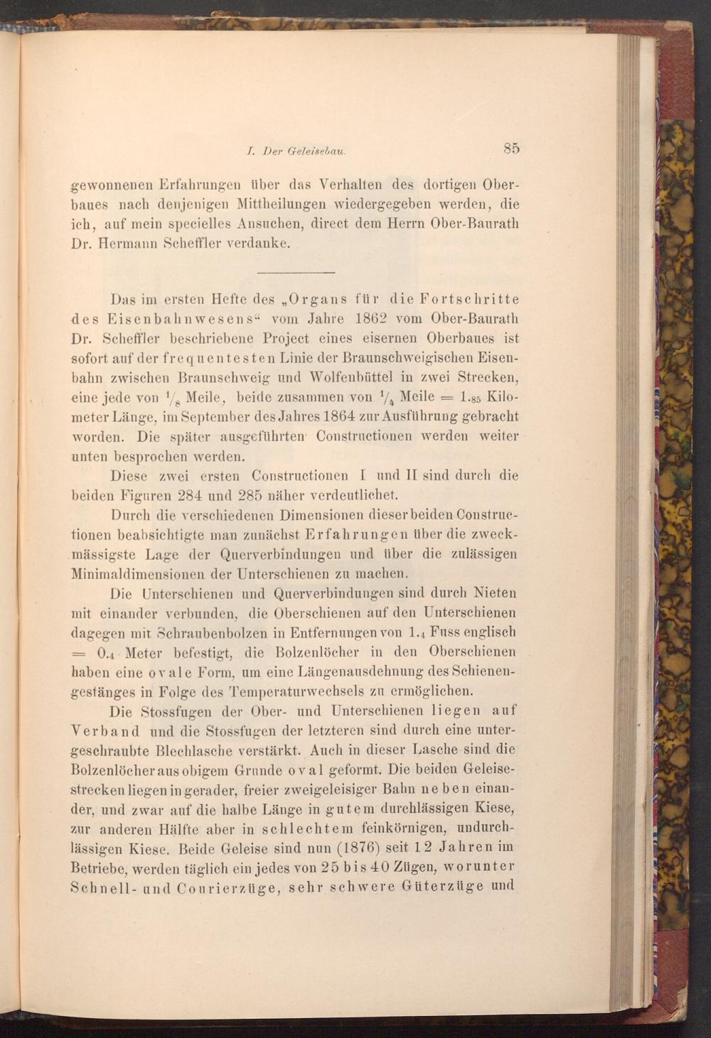 gewonnenen Erfahrungen über das Verhalten des dortigen Oberbaues nach denjenigen Mittheilungen wiedergegeben werden, die ich, auf mein specielles Ansuchen, direct dem Herrn Ober- Baurath Dr. Hermann Scheffler verdanke.