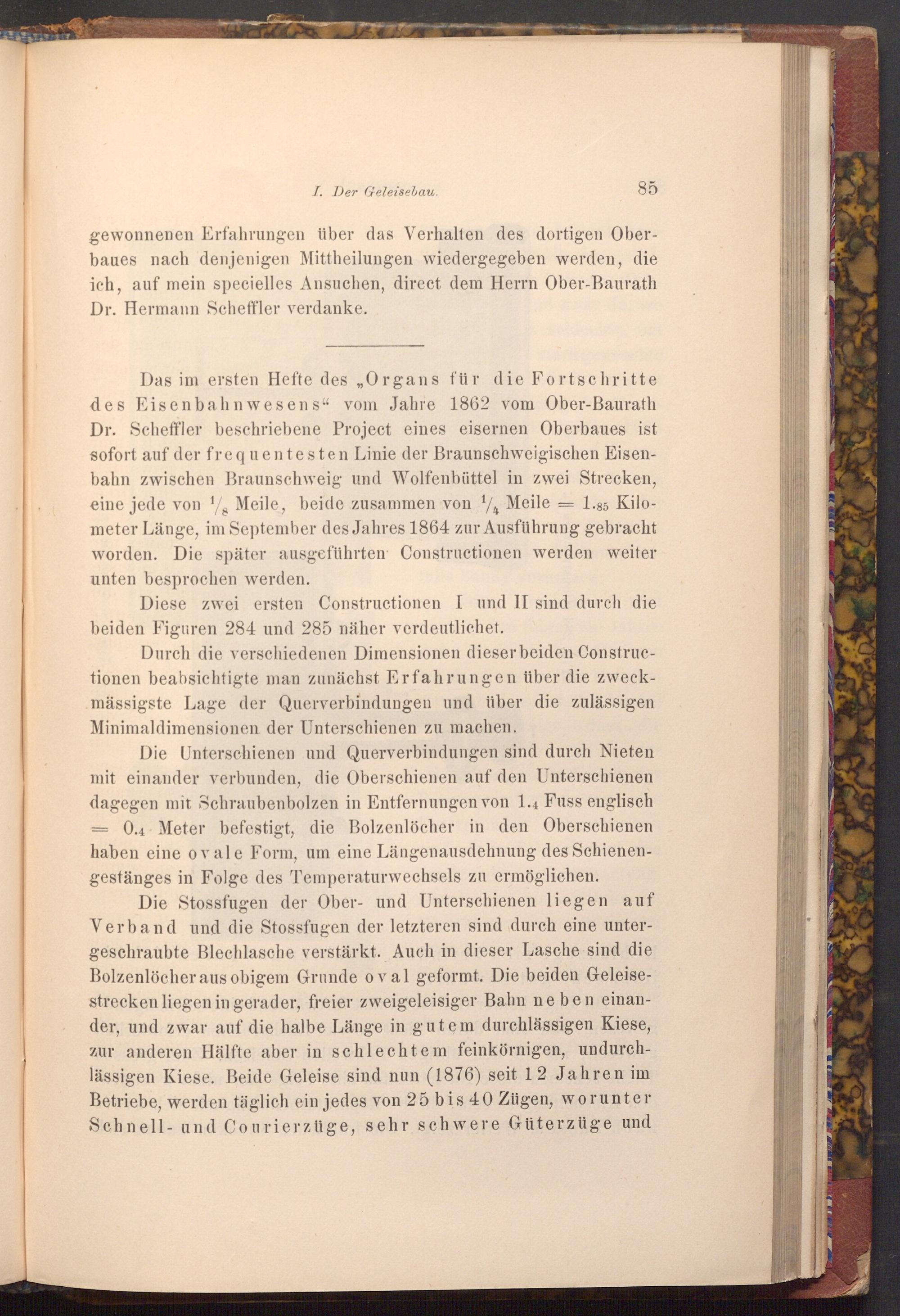 Das im ersten Hefte des„ Organs für die Fortschritte des Eisenbahnwesens" vom Jahre 1862 vom Ober- Baurath Dr. Scheffler beschriebene Project eines eisernen Oberbaues ist sofort auf der frequentesten Linie der Braunschweigischen Eisenbahn zwischen Braunschweig und Wolfenbüttel in zwei Strecken, eine jede von Meile, beide zusammen von 14 Meile 1.85 Kilometer Länge, im September des Jahres 1864 zur Ausführung gebracht worden. Die später ausgeführten Constructionen werden weiter unten besprochen werden.