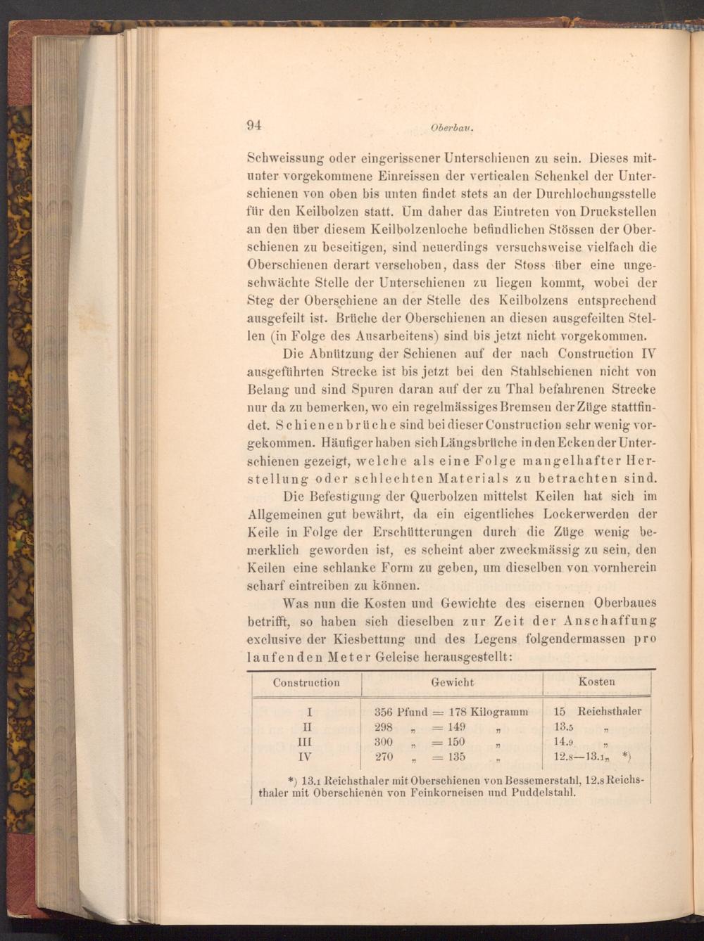 Was nun die Kosten und Gewichte des eisernen Oberbaues betrifft, so haben sich dieselben zur Zeit der Anschaffung exclusive der Kiesbettung und des Legens folgendermassen pro laufenden Meter Geleise herausgestellt: