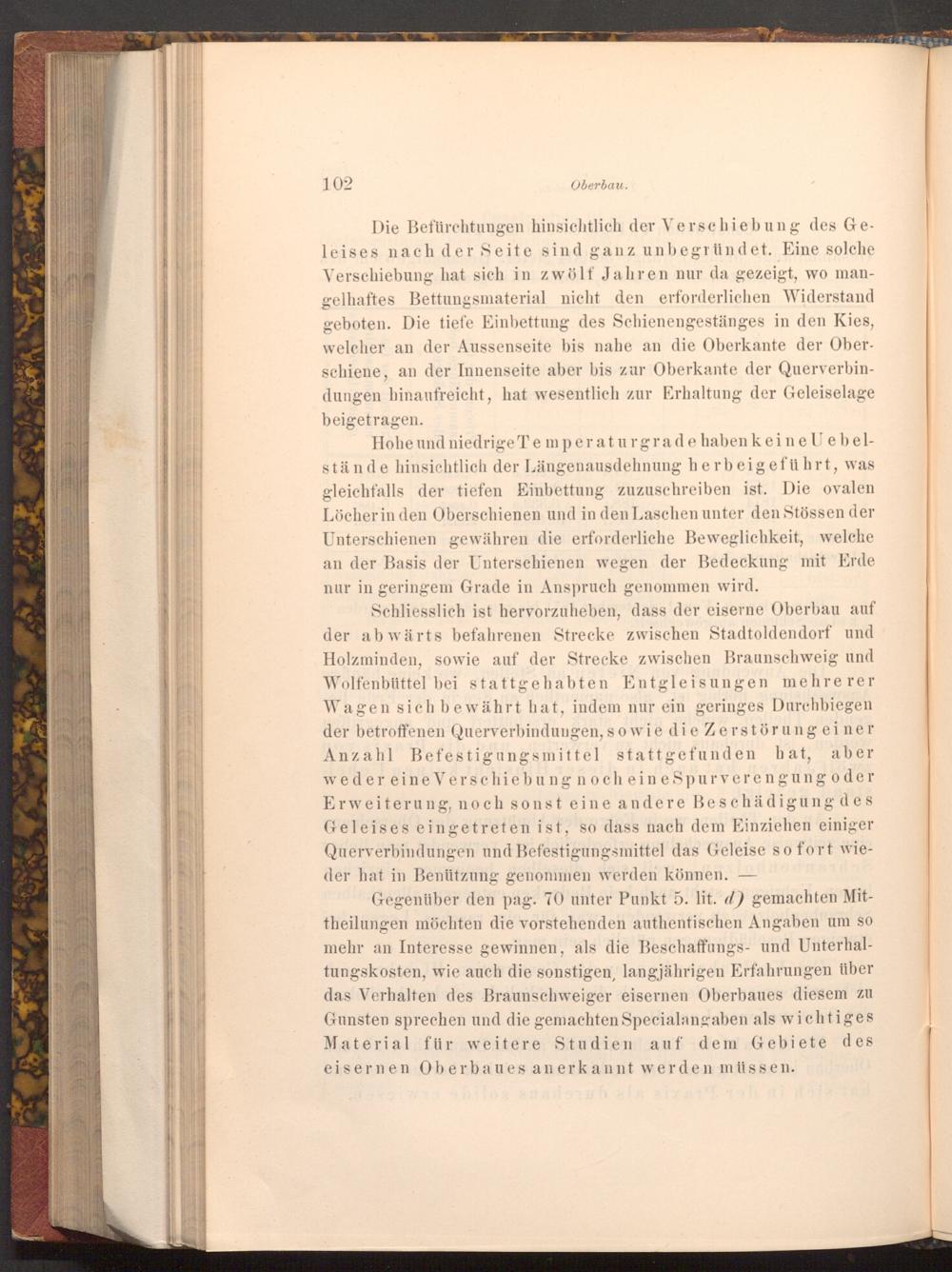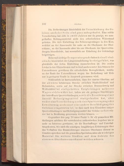 Gegenüber den pag. 70 unter Punkt 5. lit. d) gemachten Mittheilungen möchten die vorstehenden authentischen Angaben um so mehr an Interesse gewinnen, als die Beschaffungs- und Unterhaltungskosten, wie auch die sonstigen, langjährigen Erfahrungen über das Verhalten des Braunschweiger eisernen Oberbaues diesem zu Gunsten sprechen und die gemachten Specialangaben als wichtiges Material für weitere Studien auf dem Gebiete des eisernen Oberbaues anerkannt werden müssen.