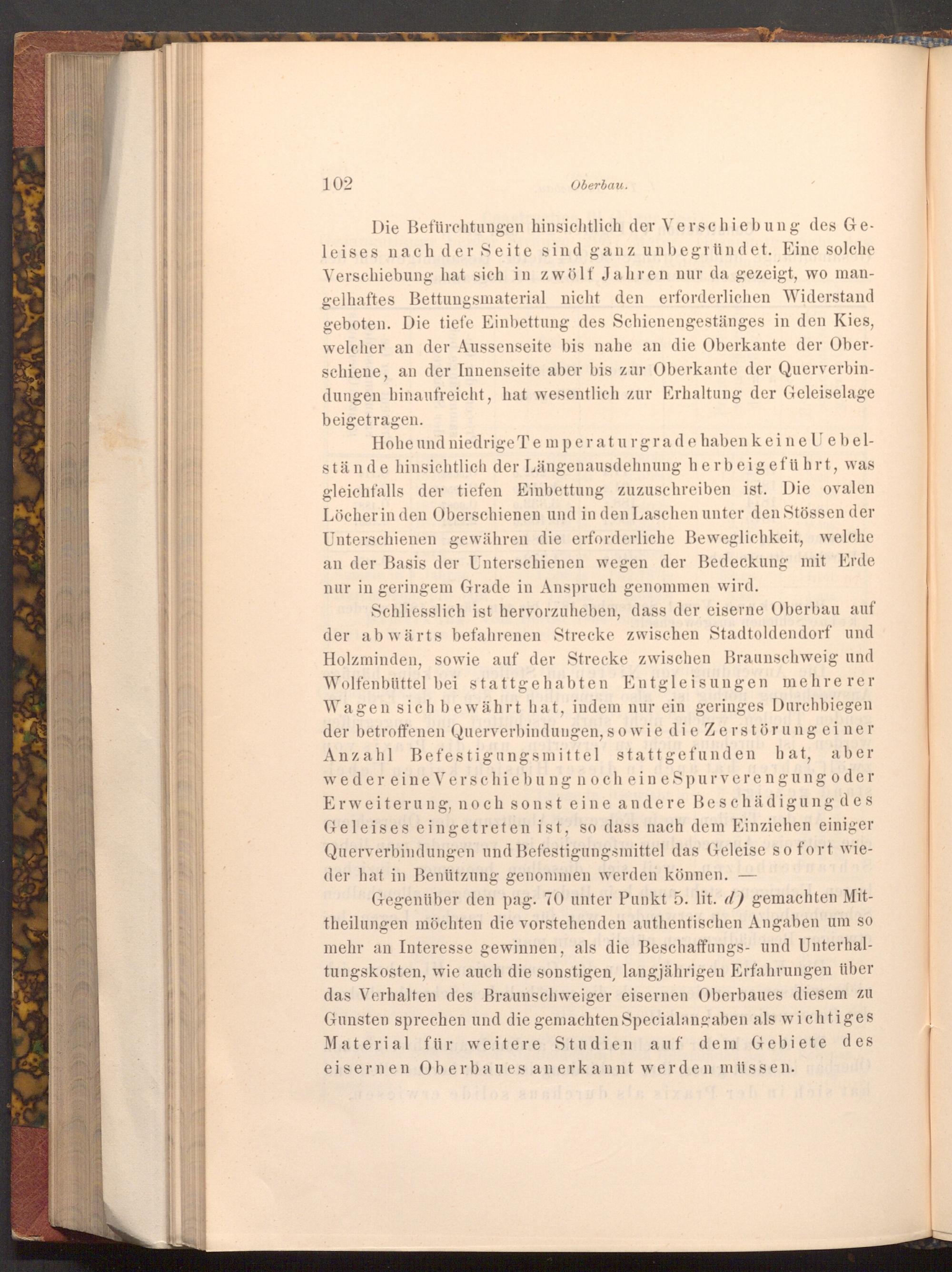 Schliesslich ist hervorzuheben, dass der eiserne Oberbau auf der abwärts befahrenen Strecke zwischen Stadtoldendorf und Holzminden, sowie auf der Strecke zwischen Braunschweig und Wolfenbüttel bei stattgehabten Entgleisungen mehrerer Wagen sich bewährt hat, indem nur ein geringes Durchbiegen der betroffenen Querverbindungen, sowie die Zerstörung einer Anzahl Befestigungsmittel stattgefunden hat, aber weder eine Verschiebung noch eine Spurverengung oder Erweiterung, noch sonst eine andere Beschädigung des Geleises eingetreten ist, so dass nach dem Einziehen einiger Querverbindungen und Befestigungsmittel das Geleise sofort wieder hat in Benützung genommen werden können. doda
