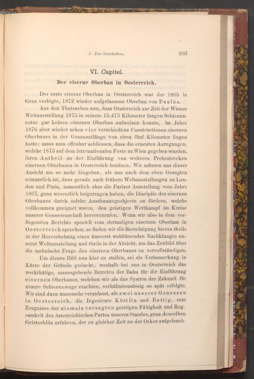 Um dieses Bild nun klar zu stellen, sei als Vorbemerkung in Kürze der Gründe gedacht, weshalb bei uns in Oesterreich das werkthätige, maassgebende Betreten der Bahn für die Einführung eisernen Oberbaues, welchen wir als das System der Zukunft für unsere Schienenwege erachten, verhältnissmässig so spät erfolgte. Wir sind dazu umsomehr veranlasst, als zwei unserer Genossen in Oesterreich, die Ingenieure Köstlin und Battig, zum Zeugnisse der niemals versagten geistigen Fähigkeit und Regsamkeit des österreichischen Partes unseres Standes, ganz denselben Geistesblitz erfuhren, der zu gleicher Zeit an der Ocker aufgeleuch