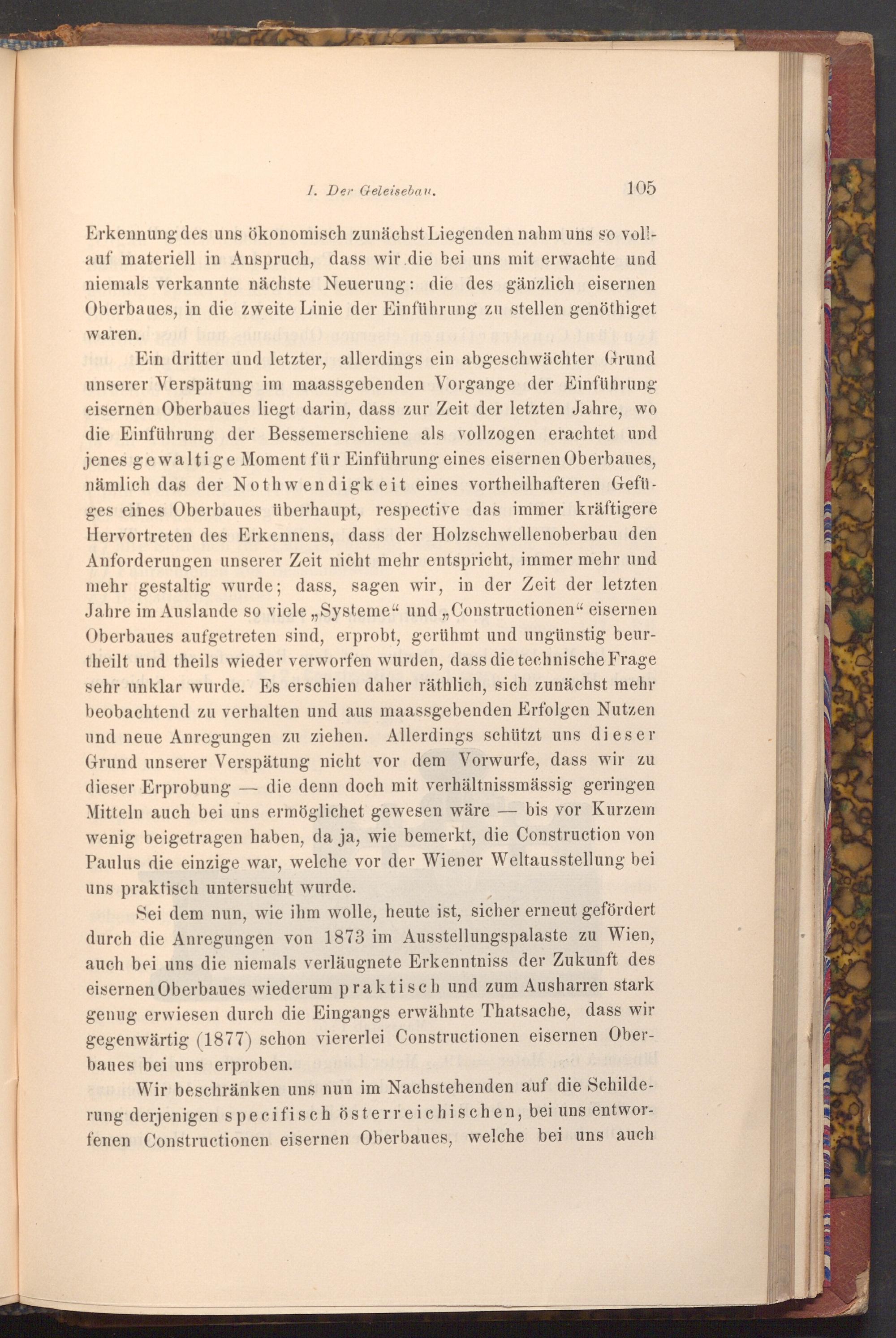 Sei dem nun, wie ihm wolle, heute ist, sicher erneut gefördert durch die Anregungen von 1873 im Ausstellungspalaste zu Wien, auch bei uns die niemals verläugnete Erkenntniss der Zukunft des eisernen Oberbaues wiederum praktisch und zum Ausharren stark genug erwiesen durch die Eingangs erwähnte Thatsache, dass wir gegenwärtig( 1877) schon viererlei Constructionen eisernen Oberbaues bei uns erproben.