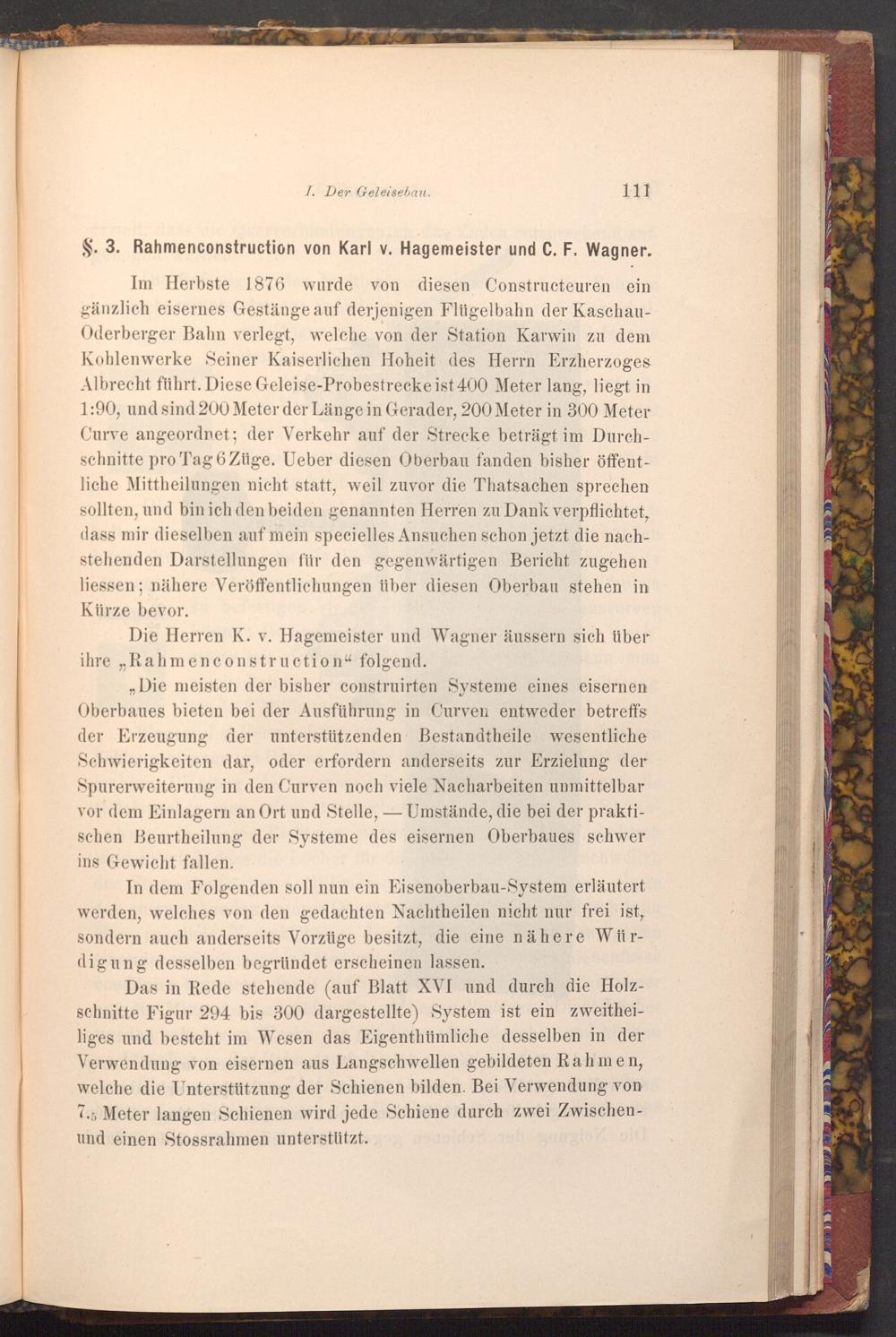 §. 3. Rahmenconstruction von Karl v. Hagemeister und C. F. Wagner. Im Herbste 1876 wurde von diesen Constructeuren ein gänzlich eisernes Gestänge auf derjenigen Flügelbahn der KaschauOderberger Bahn verlegt, welche von der Station Karwin zu dem Kohlenwerke Seiner Kaiserlichen Hoheit des Herrn Erzherzoges Albrecht führt. Diese Geleise- Probestrecke ist 400 Meter lang, liegt in 1:90, und sind 200 Meter der Länge in Gerader, 200 Meter in 300 Meter Curve angeordnet; der Verkehr auf der Strecke beträgt im Durchschnitte pro Tag 6 Züge. Ueber diesen Oberbau fanden bisher öffentliche Mittheilungen nicht statt, weil zuvor die Thatsachen sprechen sollten, und bin ich den beiden genannten Herren zu Dank verpflichtet, dass mir dieselben auf mein specielles Ansuchen schon jetzt die nachstehenden Darstellungen für den gegenwärtigen Bericht zugehen liessen; nähere Veröffentlichungen über diesen Oberbau stehen in Kürze bevor.