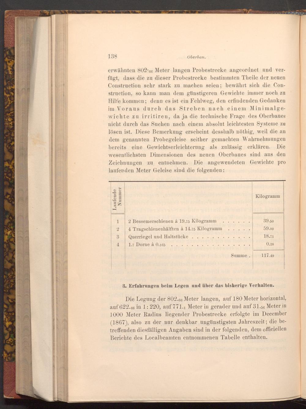 erwähnten 802.66 Meter langen Probestrecke angeordnet und verfügt, dass die zu dieser Probestrecke bestimmten Theile der neuen Construction sehr stark zu machen seien; bewährt sich die Construction, so kann man dem günstigeren Gewichte immer noch zu Hilfe kommen; denn es ist ein Fehlweg, den erfindenden Gedanken im Voraus durch das Streben nach einem Minimalgewichte zu irritiren, da ja die technische Frage des Oberbaues nicht durch das Suchen nach einem absolut leichtesten Systeme zu lösen ist. Diese Bemerkung erscheint desshalb nöthig, weil die an dem genannten Probegeleise seither gemachten Wahrnehmungen bereits eine Gewichtserleichterung als zulässig erklären. Die wesentlichsten Dimensionen des neuen Oberbaues sind aus den Zeichnungen zu entnehmen. Die angewendeten Gewichte pro laufenden Meter Geleise sind die folgenden: