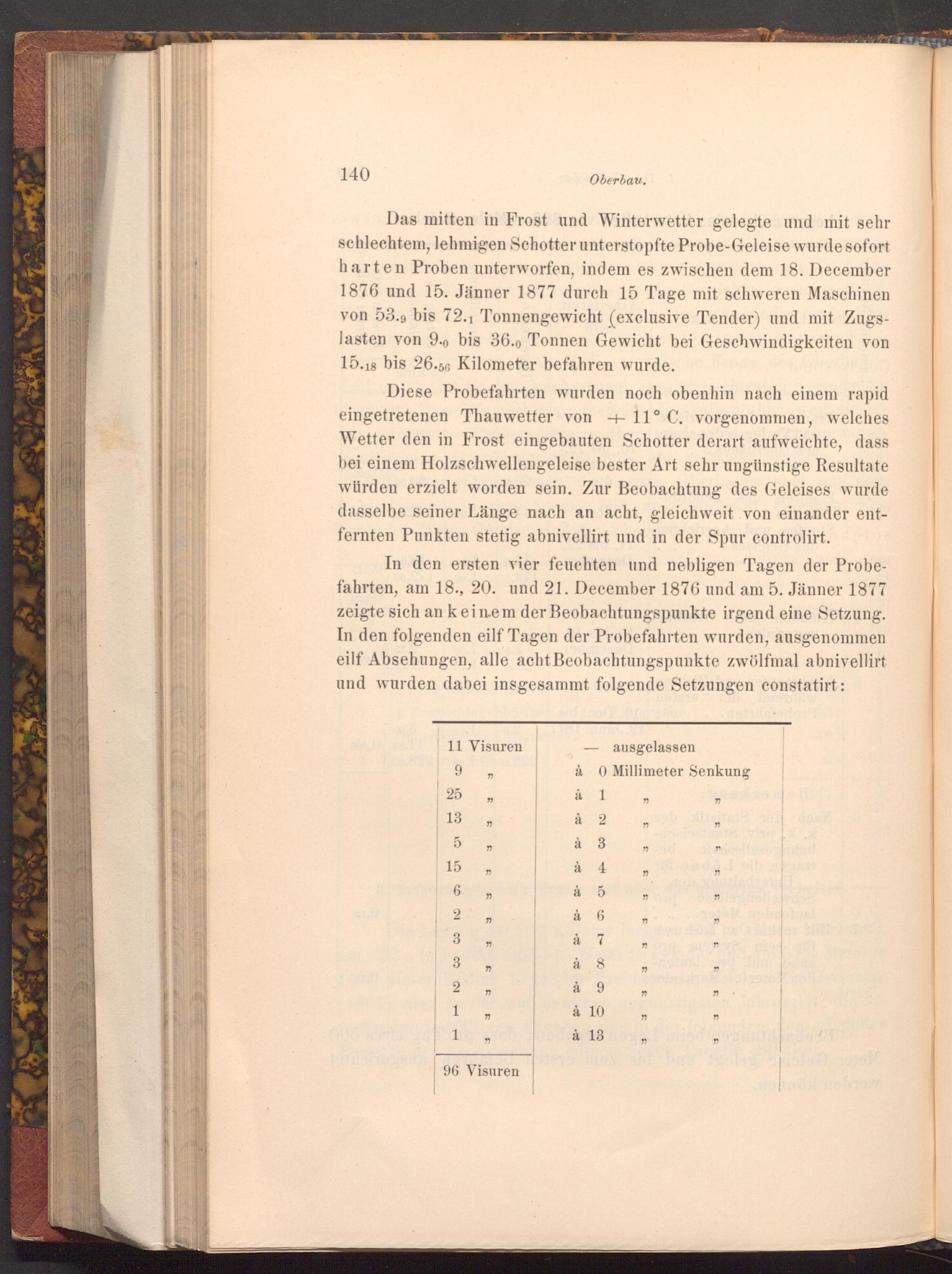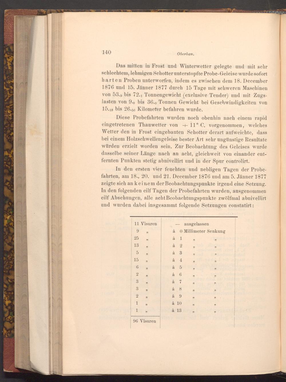 Das mitten in Frost und Winterwetter gelegte und mit sehr schlechtem, lehmigen Schotter unterstopfte Probe- Geleise wurde sofort harten Proben unterworfen, indem es zwischen dem 18. December 1876 und 15. Jänner 1877 durch 15 Tage mit schweren Maschinen von 53.9 bis 72.1 Tonnengewicht( exclusive Tender) und mit Zugslasten von 9.0 bis 36.0 Tonnen Gewicht bei Geschwindigkeiten von 15.18 bis 26.56 Kilometer befahren wurde.