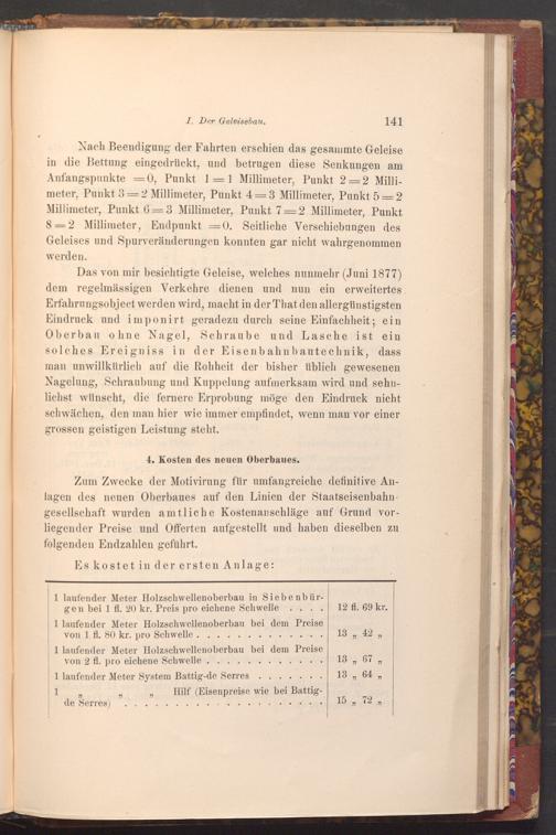 Das von mir besichtigte Geleise, welches nunmehr( Juni 1877) dem regelmässigen Verkehre dienen und nun ein erweitertes Erfahrungsobject werden wird, macht in der That den allergünstigsten Eindruck und imponirt geradezu durch seine Einfachheit; ein Oberbau ohne Nagel, Schraube und Lasche ist ein solches Ereigniss in der Eisenbahnbautechnik, dass man unwillkürlich auf die Rohheit der bisher üblich gewesenen Nagelung, Schraubung und Kuppelung aufmerksam wird und sehnlichst wünscht, die fernere Erprobung möge den Eindruck nicht schwächen, den man hier wie immer empfindet, wenn man vor einer grossen geistigen Leistung steht.