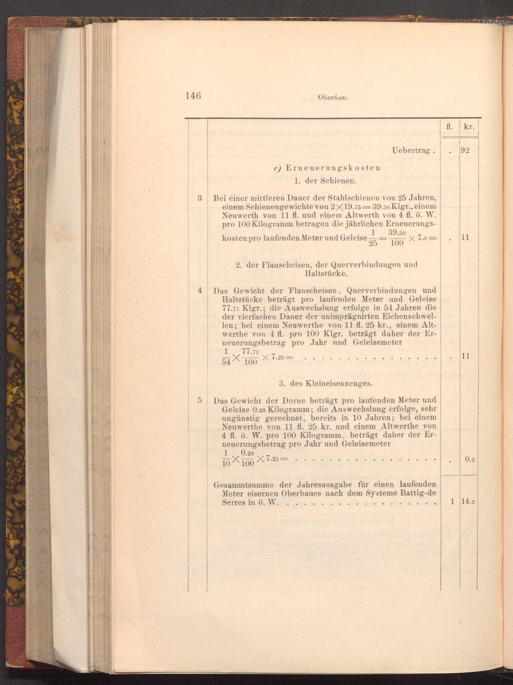Das Gewicht der Flanscheisen, Querverbindungen und Haltstücke beträgt pro laufenden Meter und Geleise 77.71 Klgr.; die Auswechslung erfolge in 54 Jahren die der vierfachen Dauer der unimprägnirten Eichenschwellen; bei einem Neuwerthe von 11 fl. 25 kr., einem Altwerthe von 4 fl. pro 100 Klgr. beträgt daher der Erneuerungsbetrag pro Jahr und Geleisemeter 1 77.71