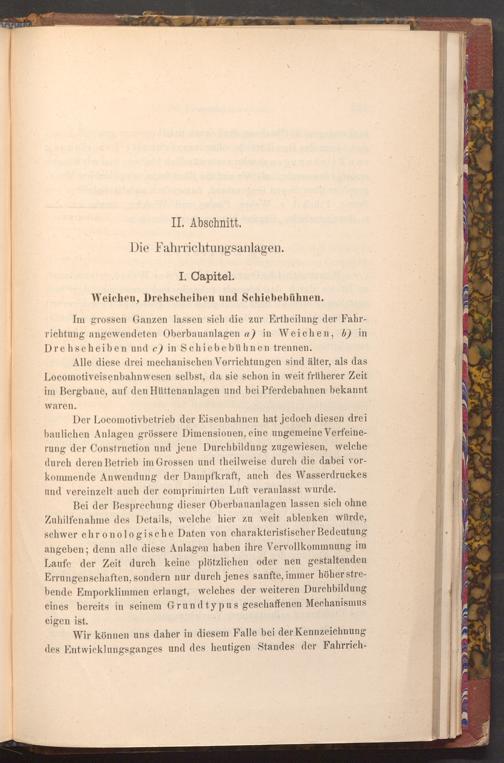 Der Locomotivbetrieb der Eisenbahnen hat jedoch diesen drei baulichen Anlagen grössere Dimensionen, eine ungemeine Verfeinerung der Construction und jene Durchbildung zugewiesen, welche durch deren Betrieb im Grossen und theilweise durch die dabei vorkommende Anwendung der Dampfkraft, auch des Wasserdruckes und vereinzelt auch der comprimirten Luft veranlasst wurde.