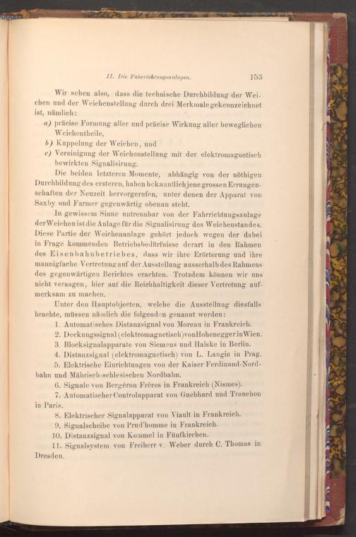 1. Automatisches Distanzsignal von Moreau in Frankreich. 2. Deckungssignal( elektromagnetisch) von Hohenegger in Wien. 3. Blocksignalapparate von Siemens und Halske in Berlin. 4. Distanzsignal( elektromagnetisch) von L. Langie in Prag. 5. Elektrische Einrichtungen von der Kaiser Ferdinand- Nordbahn und Mährisch- schlesischen Nordbahın.