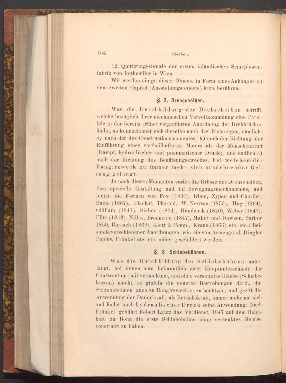 Je nach diesen Momenten variirt die Grösse der Drehscheiben, ihre specielle Gestaltung und ihr Bewegungsmechanismus, und bieten die Formen von Fox( 1830), Irlam, Zypen und Charlier, Baine( 1867), Flachat, Thorold, W. Newton( 1853), Hug( 1864), Oldham( 1841), Sieber( 1864), Handcock( 1840), Weber( 1847), Ellis( 1843), Nillus, Broomann( 1847), Mallet und Dawson, Barlow 1850, Buresch( 1869), Klett& Comp., Kraus( 1866) etc. etc.: Beispiele verschiedener Anordnungen, wie sie von Armengaud, Dingler Paulus, Fränkel etc. etc. näher geschildert werden.