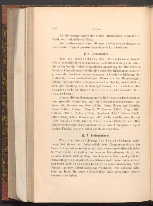 Was die Durchbildung der Drehscheiben betrifft, welche bezüglich ihrer mechanischen Vervollkommnung eine Parallele in der bereits früher vorgeführten Anordnung der Drehbrücken findet, so kennzeichnet sich dieselbe nach drei Richtungen, nämlich: a) nach der des Constructionsmomentes, b) nach der Richtung der Einführung eines vortheilhafteren Motors als der Menschenkraft ( Dampf, hydraulischer und pneumatischer Druck), und endlich c) nach der Richtung des Benützungszweckes, bei welchem der Rangirzweck zu immer mehr sich ausdehnender Geltung gelangt.