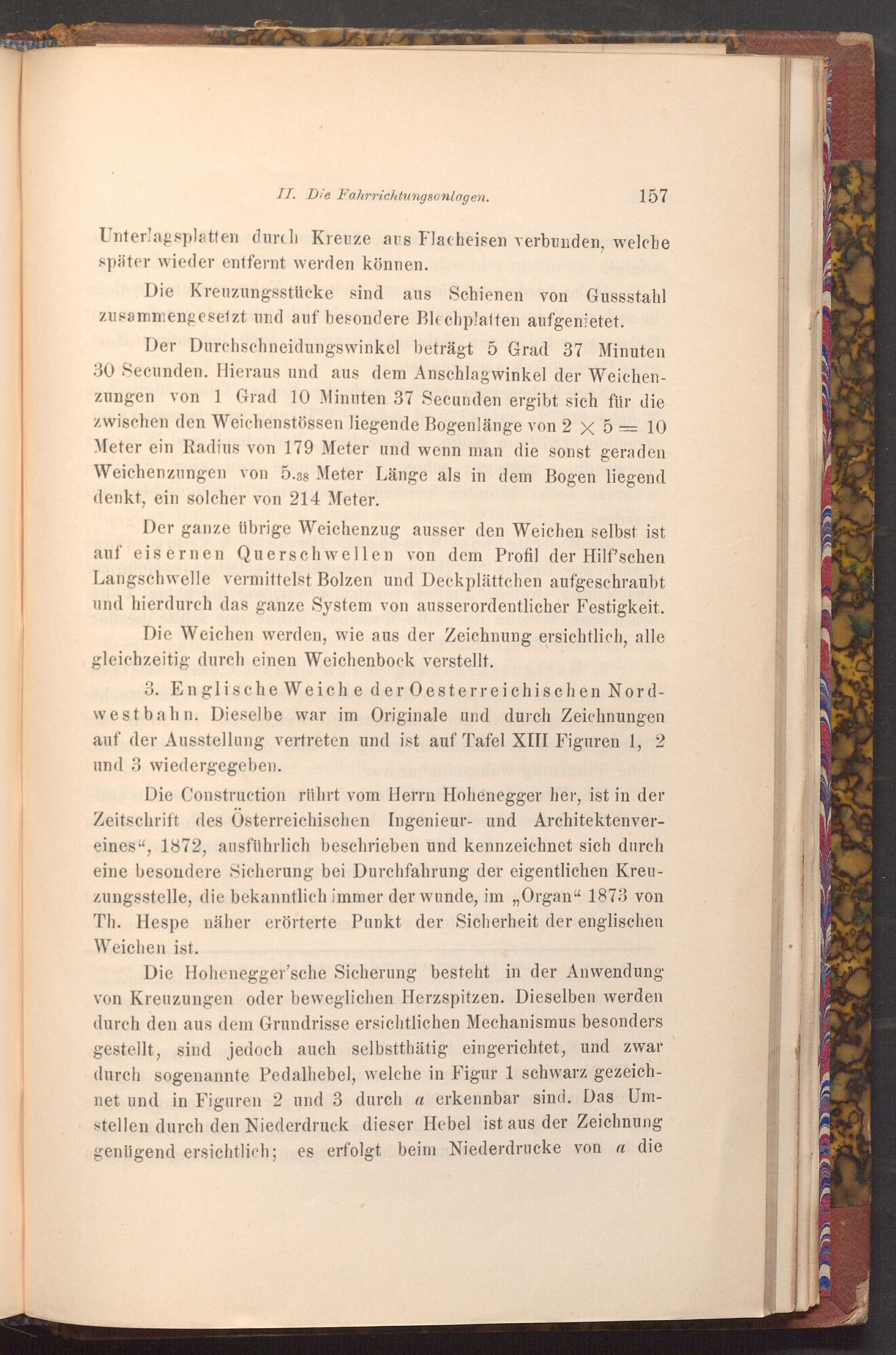 Die Construction rührt vom Herrn Hohenegger her, ist in der Zeitschrift des Österreichischen Ingenieur- und Architektenvereines", 1872, ausführlich beschrieben und kennzeichnet sich durch eine besondere Sicherung bei Durchfahrung der eigentlichen Kreuzungsstelle, die bekanntlich immer der wunde, im„ Organ" 1873 von Th. Hespe näher erörterte Punkt der Sicherheit der englischen Weichen ist.