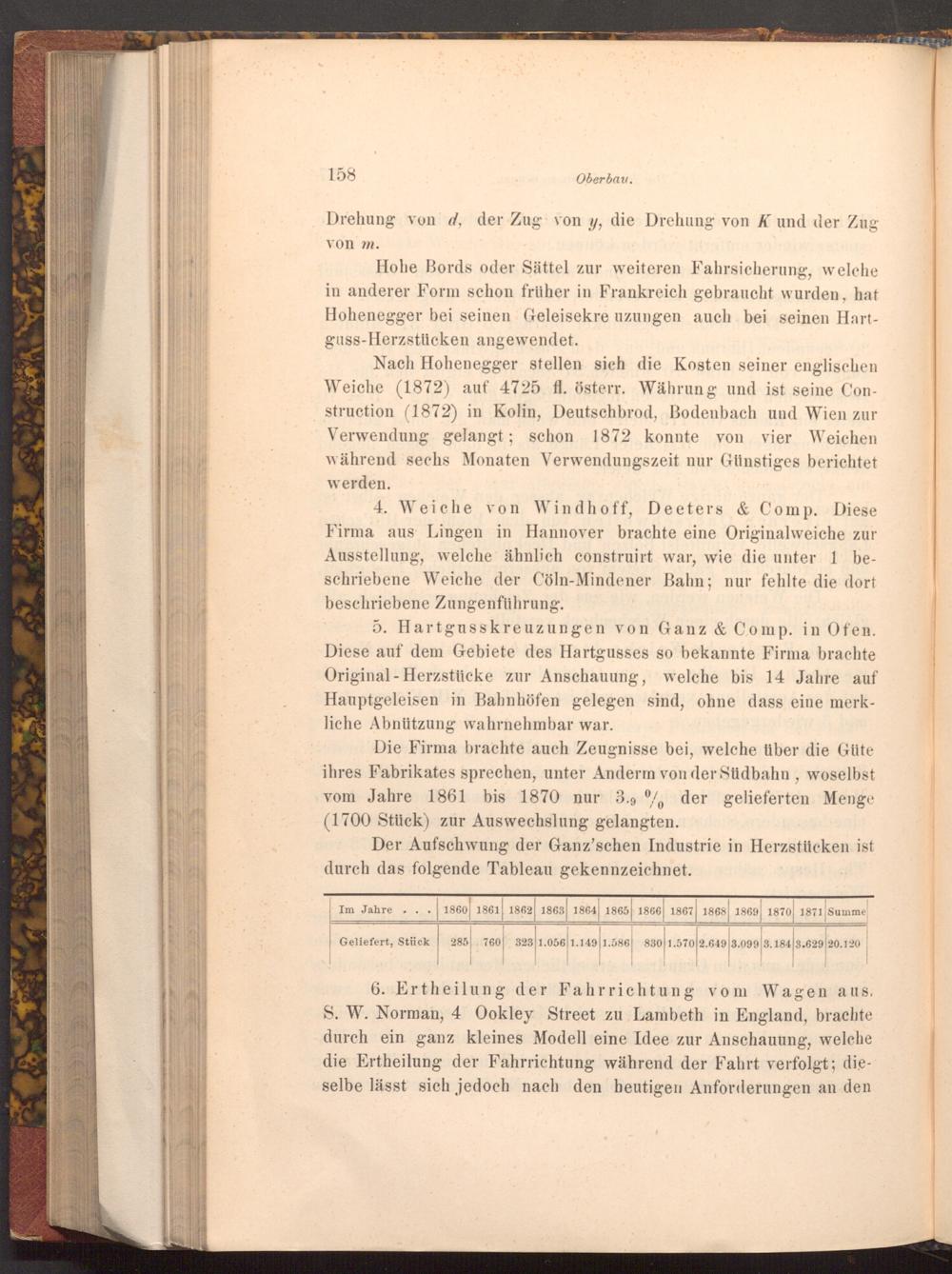 5. Hartgusskreuzungen von Ganz& Comp. in Ofen. Diese auf dem Gebiete des Hartgusses so bekannte Firma brachte Original- Herzstücke zur Anschauung, welche bis 14 Jahre auf Hauptgeleisen in Bahnhöfen gelegen sind, ohne dass eine merkliche Abnützung wahrnehmbar war.