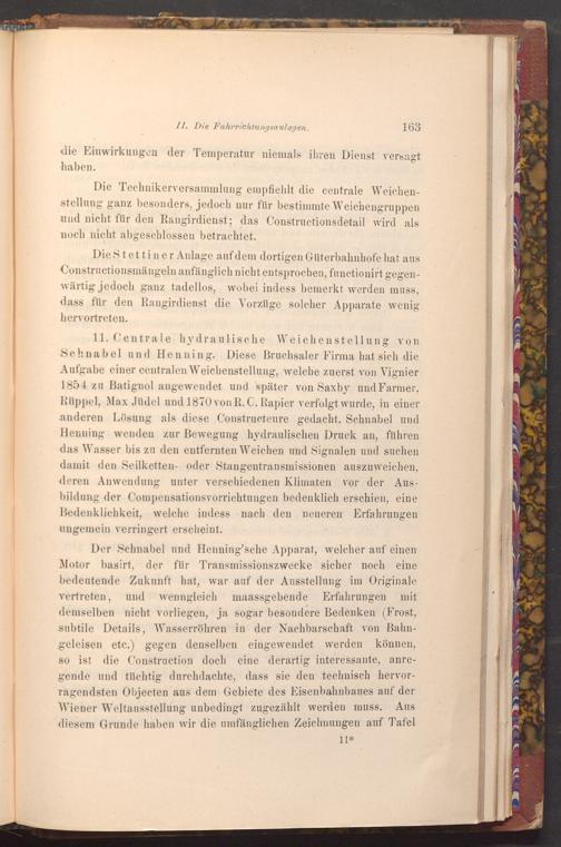 Der Schnabel und Henning'sche Apparat, welcher auf einen Motor basirt, der für Transmissionszwecke sicher noch eine bedeutende Zukunft hat, war auf der Ausstellung im Originale vertreten, und wenngleich maassgebende Erfahrungen mit demselben nicht vorliegen, ja sogar besondere Bedenken( Frost, subtile Details, Wasserröhren in der Nachbarschaft von Bahngeleisen etc.) gegen denselben eingewendet werden können, so ist die Construction doch eine derartig interessante, anregende und tüchtig durchdachte, dass sie den technisch hervorragendsten Objecten aus dem Gebiete des Eisenbahnbaues auf der Wiener Weltausstellung unbedingt zugezählt werden muss. diesem Grunde haben wir die umfänglichen Zeichnungen auf Tafel
