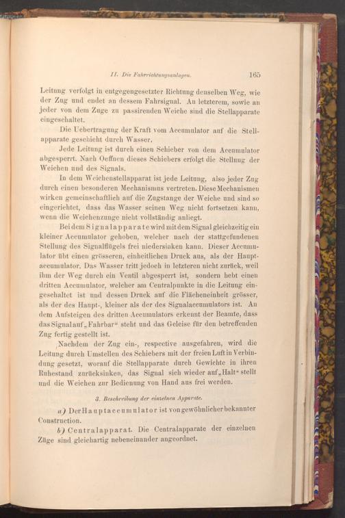 Bei dem Signalapparate wird mit dem Signal gleichzeitig ein kleiner Accumulator gehoben, welcher nach der stattgefundenen Stellung des Signalflügels frei niedersinken kann. Dieser Accumulator übt einen grösseren, einheitlichen Druck aus, als der Hauptaccumulator. Das Wasser tritt jedoch in letzteren nicht zurück, weil ihm der Weg durch ein Ventil abgesperrt ist, sondern hebt einen dritten Accumulator, welcher am Centralpunkte in die Leitung eingeschaltet ist und dessen Druck auf die Flächeneinheit grösser, als der des Haupt-, kleiner als der des Signalaccumulators ist. An dem Aufsteigen des dritten Accumulators erkennt der Beamte, dass das Signal auf ,, Fahrbar" steht und das Geleise für den betreffenden Zug fertig gestellt ist.