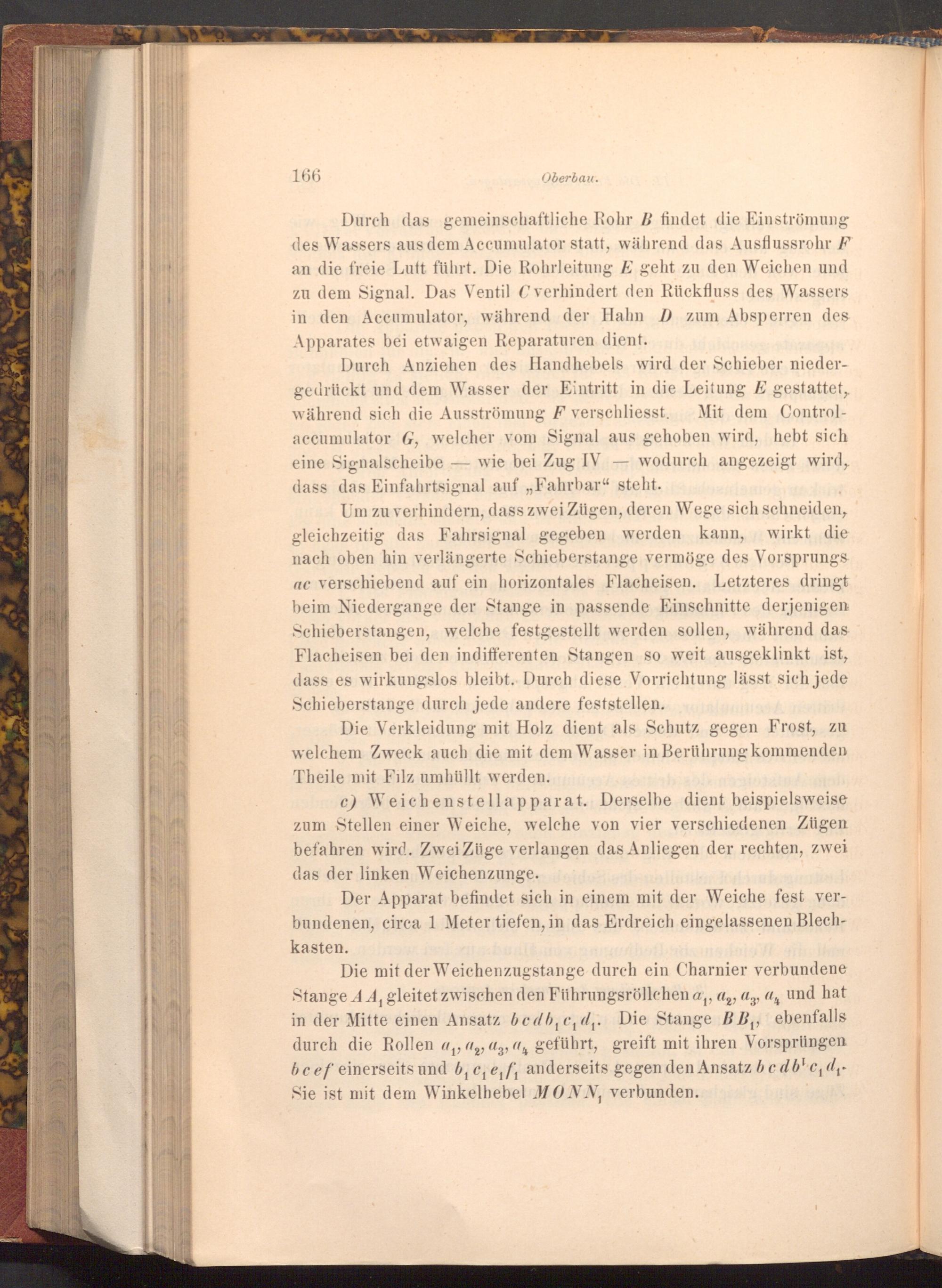 Durch das gemeinschaftliche Rohr B findet die Einströmung des Wassers aus dem Accumulator statt, während das Ausflussrohr F an die freie Luft führt. Die Rohrleitung E geht zu den Weichen und zu dem Signal. Das Ventil C verhindert den Rückfluss des Wassers in den Accumulator, während der Hahn D zum Absperren des Apparates bei etwaigen Reparaturen dient.