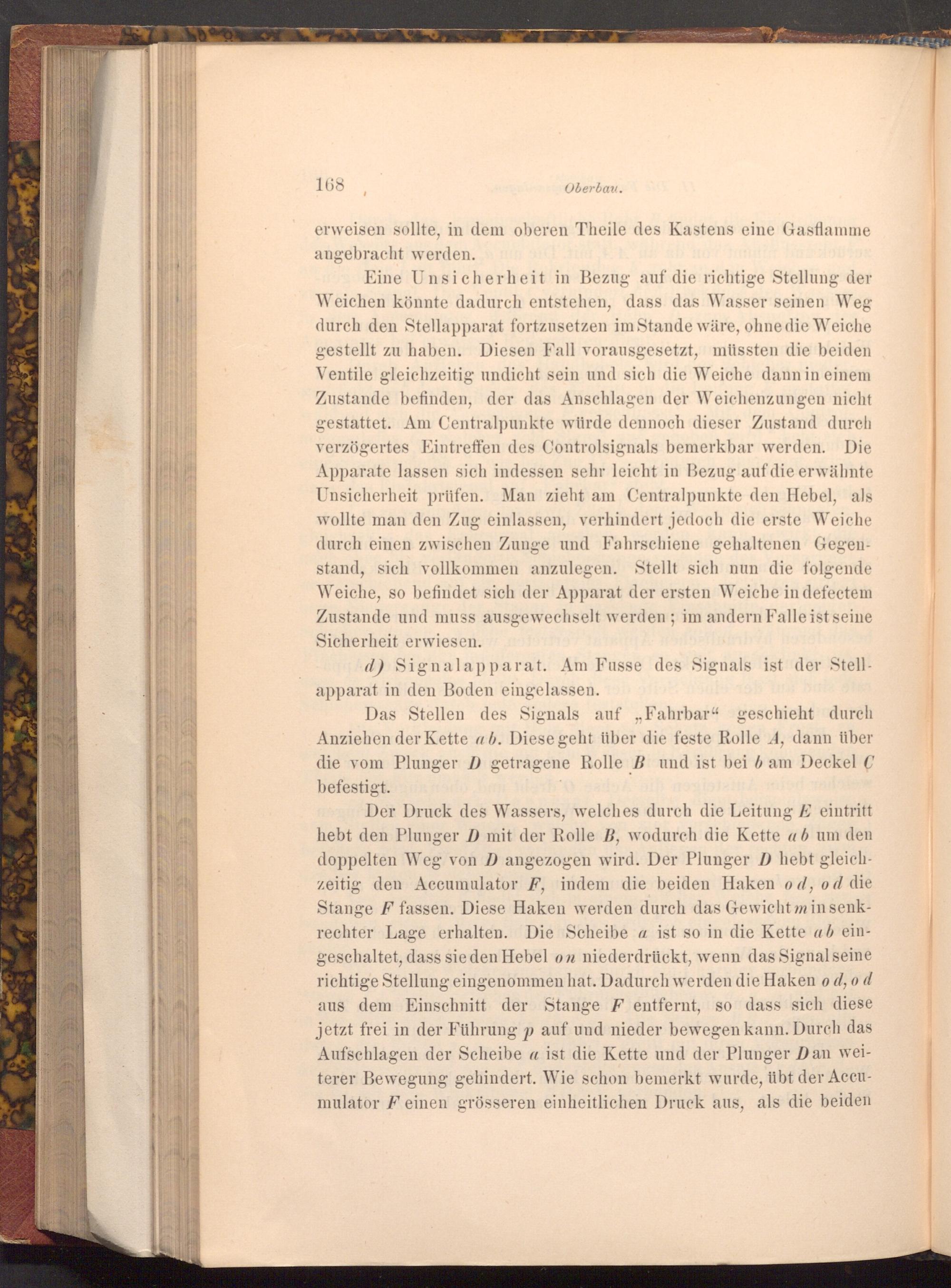 Der Druck des Wassers, welches durch die Leitung E eintritt hebt den Plunger D mit der Rolle B, wodurch die Kette ab um den doppelten Weg von D angezogen wird. Der Plunger D hebt gleichzeitig den Accumulator F, indem die beiden Haken od, od die Stange F fassen. Diese Haken werden durch das Gewicht min senkrechter Lage erhalten. Die Scheibe a ist so in die Kette ab eingeschaltet, dass sie den Hebel on niederdrückt, wenn das Signal seine richtige Stellung eingenommen hat. Dadurch werden die Haken o d, od aus dem Einschnitt der Stange F entfernt, so dass sich diese jetzt frei in der Führung p auf und nieder bewegen kann. Durch das Aufschlagen der Scheibe a ist die Kette und der Plunger Dan weiterer Bewegung gehindert. Wie schon bemerkt wurde, übt der Accumulator Feinen grösseren einheitlichen Druck aus, als die beiden