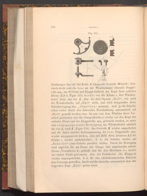 Drahtzuges das auf der Kette G hängende Gewicht M herab; hierdurch dreht sich die lose an der Wendestange sitzende Doppelrolle mm, um 90 Grad und klappt dadurch der Kopf ihrer schiefen Ebene( 2,2 in Figur 315) wieder vor die Klinke c. Der Wächterhebel steht also bei Z, also bei dem Signale„ Halt", wie auch die Wendescheibe auf„ Halt" steht, und wird demgemäss diese Hebelbewegung das, Simuliren" genannt, weil ja die Scheibe schon vorher durch den fahrenden Eisenbahnzug automatisch auf ,, Halt" gestellt worden war. Ist nun von dem Wächter diese Vorarbeit geschehen und die Stangenklinke c wieder vor den Kopf der schiefen Ebene auf der Doppelrolle mm, gebracht worden, so muss eine entgegengesetzte Bewegung am Wächterhebel nämlich die von Z, nach Z( Figur 314) das Gewicht M wieder emporheben und die dabei erzielte Kettenspannung die lose Doppelrolle mm, wieder entgegensetzt drehen, also mit Hilfe ihres Absatzes 2,2 die Klinke c wieder zurückdrehen, d. h. die Scheibe wieder auf „ Bahn frei"( zum Geleise parallel) stellen. Durch die Bewegung wird zugleich die am Fusse der Stange fest angebrachte schiefe Ebene( Viertelkreis h) gedreht und für den Hebelarm be wieder der tiefste Punkt gewonnen, also der Pedalhebel( die Klappe k) wieder emporgedrückt, d. h. für den nächstkommenden Bahnzug jene Vorsorge getroffen, durch welche derselbe automatisch dem ihm folgenden Zuge„ Halt" geben kann.