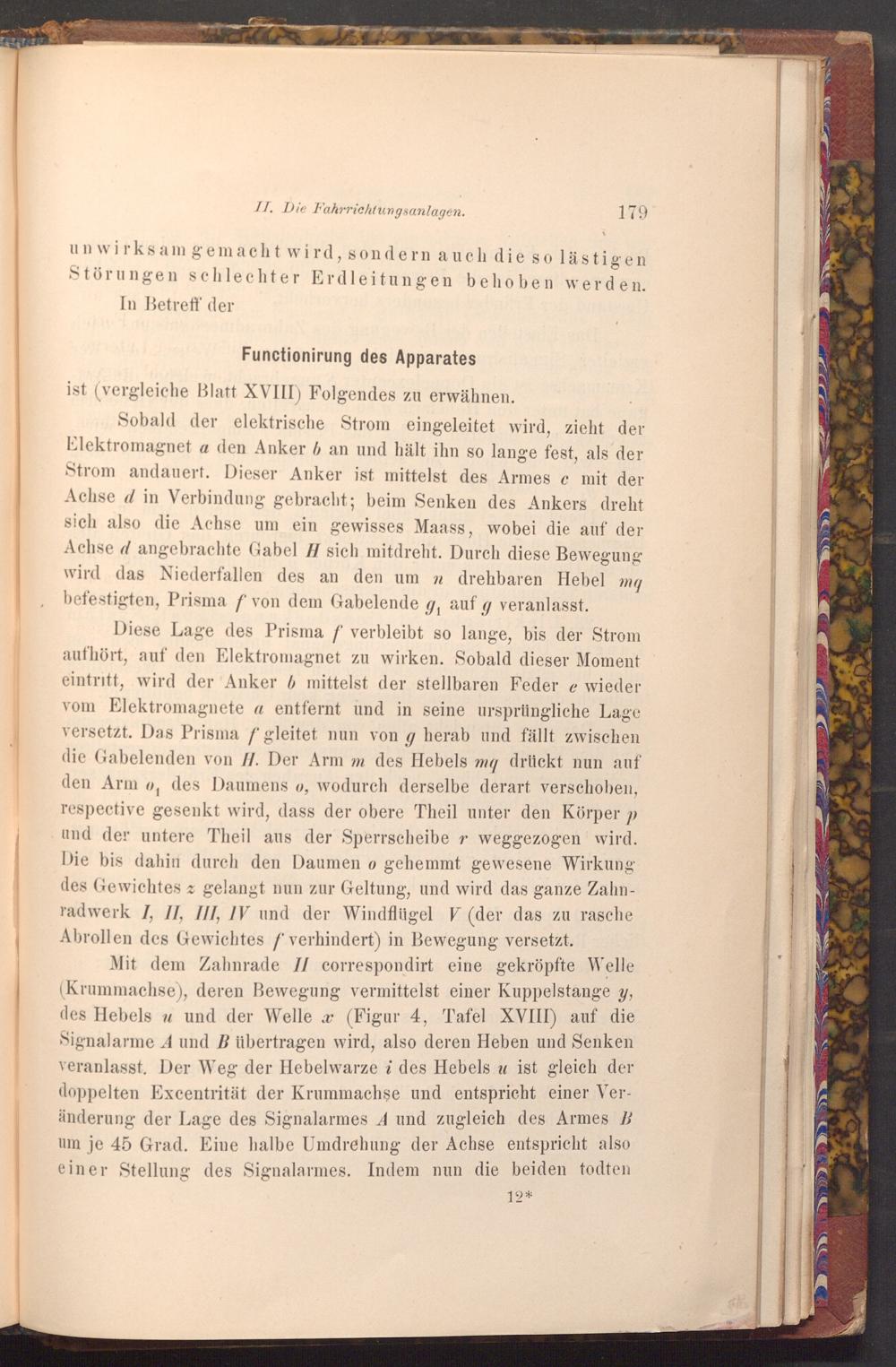 Mit dem Zahnrade II correspondirt eine gekröpfte Welle ( Krummachse), deren Bewegung vermittelst einer Kuppelstange y, des Hebels u und der Welle x( Figur 4, Tafel XVIII) auf die Signalarme A und B übertragen wird, also deren Heben und Senken veranlasst. Der Weg der Hebelwarze i des Hebels u ist gleich der doppelten Excentrität der Krummachse und entspricht einer Veränderung der Lage des Signalarmes A und zugleich des Armes B um je 45 Grad. Eine halbe Umdrehung der Achse entspricht also einer Stellung des Signalarmes. Indem nun die beiden todten