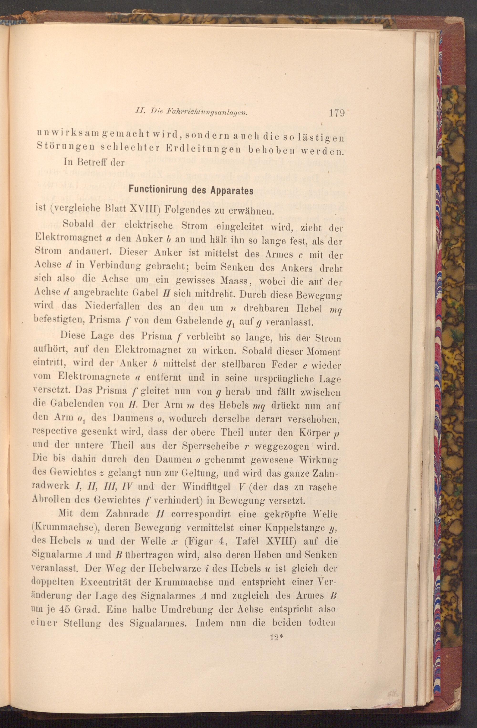 Diese Lage des Prisma f verbleibt so lange, bis der Strom aufhört, auf den Elektromagnet zu wirken. Sobald dieser Moment eintritt, wird der Anker 6 mittelst der stellbaren Feder e wieder vom Elektromagnete a entfernt und in seine ursprüngliche Lage versetzt. Das Prisma f gleitet nun von g herab und fällt zwischen die Gabelenden von H. Der Arm m des Hebels mq drückt nun auf den Arm o, des Daumens o, wodurch derselbe derart verschoben, respective gesenkt wird, dass der obere Theil unter den Körper p und der untere Theil aus der Sperrscheibe r weggezogen wird. Die bis dahin durch den Daumen o gehemmt gewesene Wirkung des Gewichtes gelangt nun zur Geltung, und wird das ganze Zahnradwerk I, II, III, IV und der Windflügel V( der das zu rasche Abrollen des Gewichtes f verhindert) in Bewegung versetzt.
