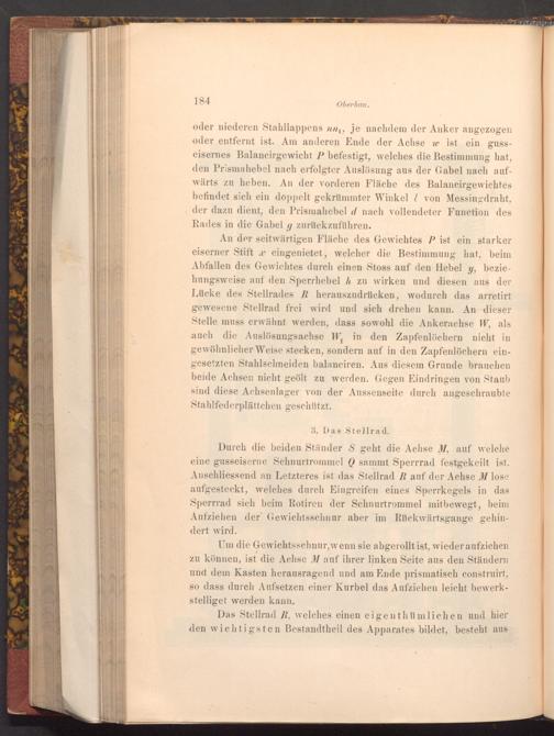 oder niederen Stahllappens nn₁, je nachdem der Anker angezogen oder entfernt ist. Am anderen Ende der Achse w ist ein gusseisernes Balancirgewicht P befestigt, welches die Bestimmung hat, den Prismahebel nach erfolgter Auslösung aus der Gabel nach aufwärts zu heben. An der vorderen Fläche des Balancirgewichtes befindet sich ein doppelt gekrümmter Winkel 7 von Messingdraht, der dazu dient, den Prismahebel d nach vollendeter Function des Rades in die Gabel g zurückzuführen.