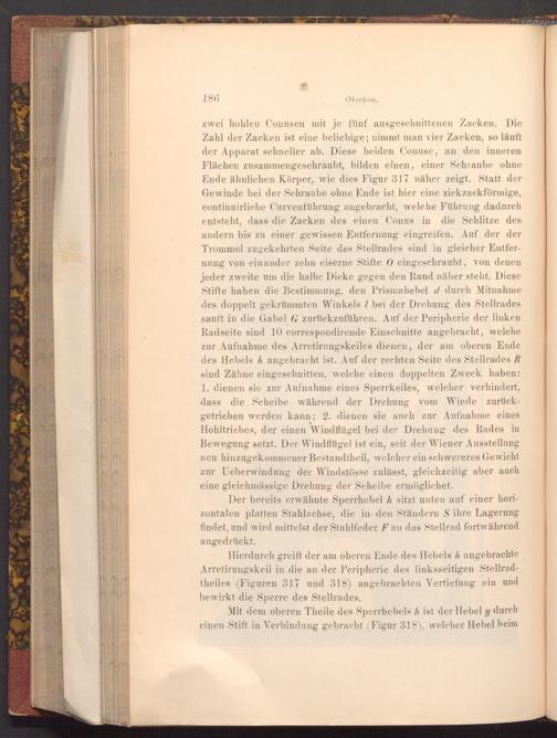 zwei hohlen Conusen mit je fünf ausgeschnittenen Zacken. Die Zahl der Zacken ist eine beliebige; nimmt man vier Zacken, so läuft der Apparat schneller ab. Diese beiden Conuse, an den inneren Flächen zusammengeschraubt, bilden einen, einer Schraube ohne Ende ähnlichen Körper, wie dies Figur 317 näher zeigt. Statt der Gewinde bei der Schraube ohne Ende ist hier eine zickzackförmige, continuirliche Curvenführung angebracht, welche Führung dadurch entsteht, dass die Zacken des einen Conus in die Schlitze des andern bis zu einer gewissen Entfernung eingreifen. Auf der der Trommel zugekehrten Seite des Stellrades sind in gleicher Entfernung von einander zehn eiserne Stifte O eingeschraubt, von denen jeder zweite um die halbe Dicke gegen den Rand näher steht. Diese Stifte haben die Bestimmung, den Prismahebel d durch Mitnahme des doppelt gekrümmten Winkels/ bei der Drehung des Stellrades sanft in die Gabel G zurückzuführen. Auf der Peripherie der linken Radseite sind 10 correspondirende Einschnitte angebracht, welche zur Aufnahme des Arretirungskeiles dienen, der am oberen Ende des Hebels h angebracht ist. Auf der rechten Seite des Stellrades R sind Zähne eingeschnitten, welche einen doppelten Zweck haben: 1. dienen sie zur Aufnahme eines Sperrkeiles, welcher verhindert, dass die Scheibe während der Drehung vom Winde zurückgetrieben werden kann; 2. dienen sie auch zur Aufnahme eines Hohltriebes, der einen Windflügel bei der Drehung des Rades in Bewegung setzt. Der Windflügel ist ein, seit der Wiener Ausstellung neu hinzugekommener Bestandtheil, welcher ein schwereres Gewicht zur Ueberwindung der Windstösse zulässt, gleichzeitig aber auch eine gleichmässige Drehung der Scheibe ermöglichet.