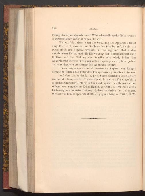 Dieser ungemein sinnreich construirte Apparat von Laugie erregte zu Wien 1873 unter den Fachgenossen gerechtes Aufsehen. Auf den Linien der k., k. priv. Staatseisenbahn- Gesellschaft wurden die Langie'schen Distanzsignale im Jahre 1874 eingeführt; es sind gegenwärtig 40 Stück in Verwendung und bewähren sich dieselben, nach eingeholter Erkundigung, vortrefflich. Der Preis eines Distanzsignals inclusive Laterne, jedoch exclusive der Leitungen, Wecker und Bureauapparate stellt sich gegenwärtig auf 270 fl. Ö. W.