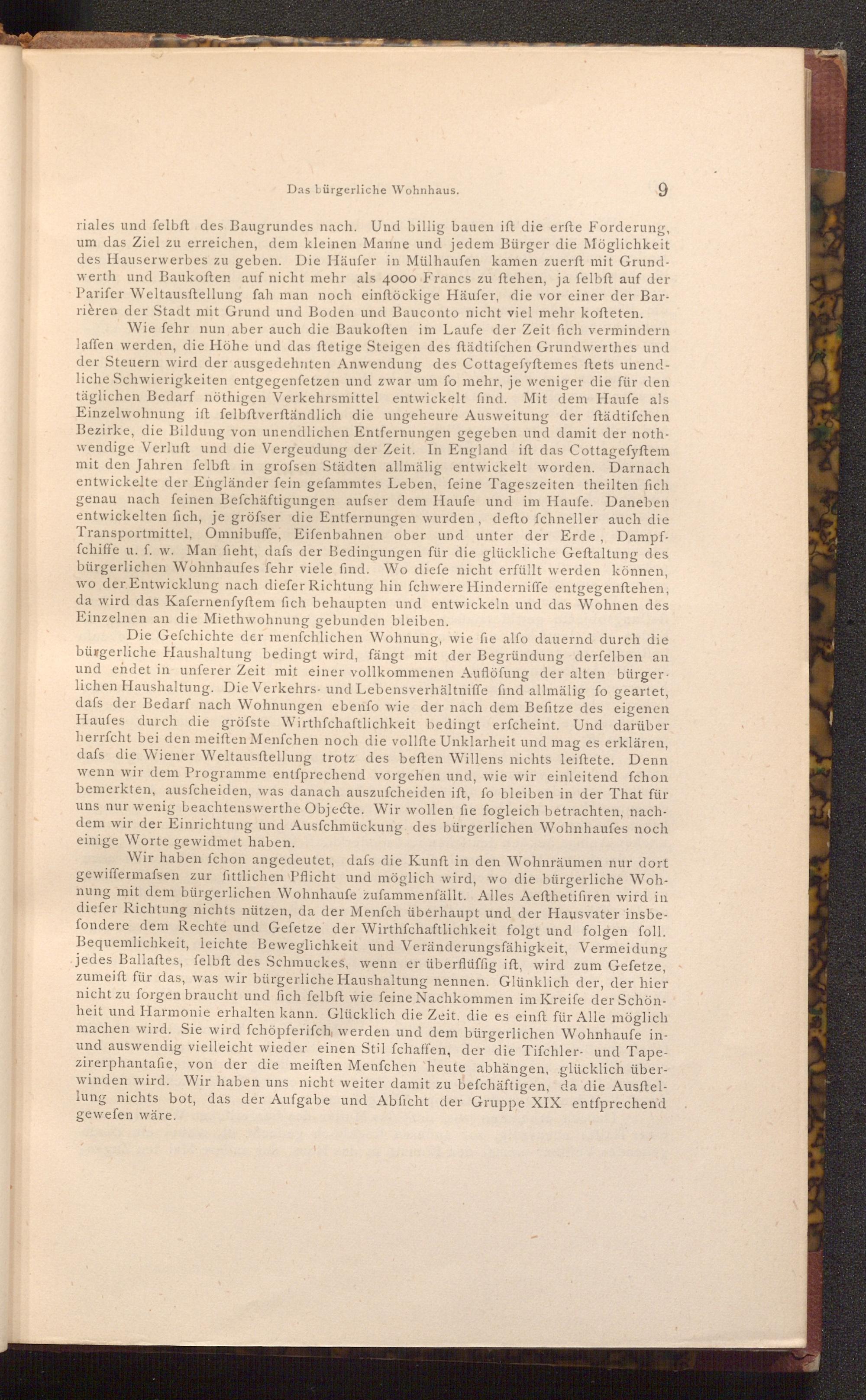 Die Gefchichte der menfchlichen Wohnung, wie fie alfo dauernd durch die bürgerliche Haushaltung bedingt wird, fängt mit der Begründung derfelben an und endet in unferer Zeit mit einer vollkommenen Auflöfung der alten bürgerlichen Haushaltung. Die Verkehrs- und Lebensverhältniffe find allmälig fo geartet, dafs der Bedarf nach Wohnungen ebenfo wie der nach dem Befitze des eigenen Haufes durch die gröfste Wirthfchaftlichkeit bedingt erfcheint. Und darüber herrfcht bei den meiften Menfchen noch die vollfte Unklarheit und mag es erklären, dafs die Wiener Weltausftellung trotz des beften Willens nichts leiftete. Denn wenn wir dem Programme entſprechend vorgehen und, wie wir einleitend fchon bemerkten, ausfcheiden, was danach auszufcheiden ift, fo bleiben in der That für uns nur wenig beachtenswerthe Objecte. Wir wollen fie fogleich betrachten, nachdem wir der Einrichtung und Ausfchmückung des bürgerlichen Wohnhaufes noch einige Worte gewidmet haben.