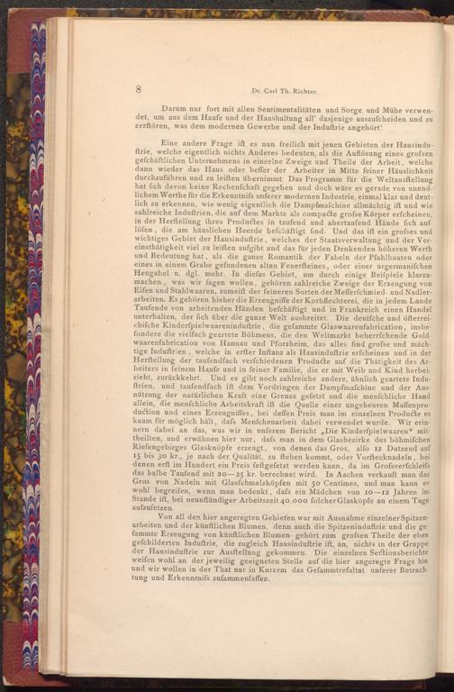 Eine andere Frage ift es nun freilich mit jenen Gebieten der Hausinduftrie, welche eigentlich nichts Anderes bedeuten, als die Auflösung eines grofsen gefchäftlichen Unternehmens in einzelne Zweige und Theile der Arbeit, welche dann wieder das Haus oder beffer der Arbeiter in Mitte feiner Häuslichkeit durchzuführen und zu leiften übernimmt. Das Programm für die Weltausstellung hat fich davon keine Rechenfchaft gegeben und doch wäre es gerade von unendlichem Werthe für die Erkenntnifs unferer modernen Industrie, einmal klar und deutlich zu erkennen, wie wenig eigentlich die Dampfmafchine allmächtig ift und wie zahlreiche Induftrien, die auf dem Markte als compacte grofse Körper erfcheinen, in der Herftellung ihres Productes in taufend und abertaufend Hände fich auflöfen, die am häuslichen Heerde befchäftigt find. Und das ift ein grofses und wichtiges Gebiet der Hausinduftrie, welches der Staatsverwaltung und der Ver einsthätigkeit viel zu leiften aufgibt und das für jeden Denkenden höheren Werth und Bedeutung hat, als die ganze Romantik der Fabeln der Pfahlbauten oder eines in einem Grabe gefundenen alten Feuerfteines, oder einer urgermanifchen Heugabel u. dgl. mehr. In diefes Gebiet, um durch einige Beiſpiele klarzumachen, was wir fagen wollen, gehören zahlreiche Zweige der Erzeugung von Eifen und Stahlwaaren, zumeift der feineren Sorten der Mefferfchmied- und Nadlerarbeiten. Es gehören hieher die Erzeugniffe der Korbflechterei, die in jedem Lande Taufende von arbeitenden Händen befchäftigt und in Frankreich einen Handel unterhalten, der fich über die ganze Welt ausbreitet. Die deutfche und öfterreichifche Kinderfpielwaareninduftrie, die gefammte Glaswaarenfabrication, insbefondere die vielfach geartete Böhmens, die den Weltmarkt beherrschende Gold waarenfabrication von Hannau und Pforzheim, das alles find grofse und mäch tige Induftrien, welche in erfter Inftanz als Hausinduftrie erfcheinen und in der Herſtellung der taufendfach verfchiedenen Producte auf die Thätigkeit des Arbeiters in feinem Haufe und in feiner Familie, die er mit Weib und Kind herbeizieht, zurückkehrt. Und es gibt noch zahlreiche andere, ähnlich geartete Induftrien, und taufendfach ift dem Vordringen der Dampfmafchine und der Ausnützung der natürlichen Kraft eine Grenze gefetzt und die menfchliche Hand allein, die menfchliche Arbeitskraft ift die Quelle einer ungeheuren Maffenproduction und eines Erzeugniffes, bei deffen Preis man im einzelnen Producte es kaum für möglich hält, dafs Menfchenarbeit dabei verwendet wurde. Wir erinnern dabei an das, was wir in unferem Bericht„ Die Kinderfpielwaaren" mittheilten, und erwähnen hier nur, dafs man in dem Glasbezirke des böhmifchen Riefengebirges Glasknöpfe erzeugt, von denen das Gros, alfo 12 Dutzend auf 15 bis 30 kr., je nach der Qualität, zu ftehen kommt, oder Vorftecknadeln, bei denen erft im Hundert ein Preis feftgefetzt werden kann, da im Grofsverfchleifs das halbe Taufend mit 20-25 kr. berechnet wird. In Aachen verkauft man das Gros von Nadeln mit Glasfchmelzköpfen mit 50 Centimes, und man kann es wohl begreifen, wenn man bedenkt, dafs ein Mädchen von 10-12 Jahren im Stande ift, bei neunftündiger Arbeitszeit 40.000 folcher Glasköpfe an einem Tage aufzufetzen.